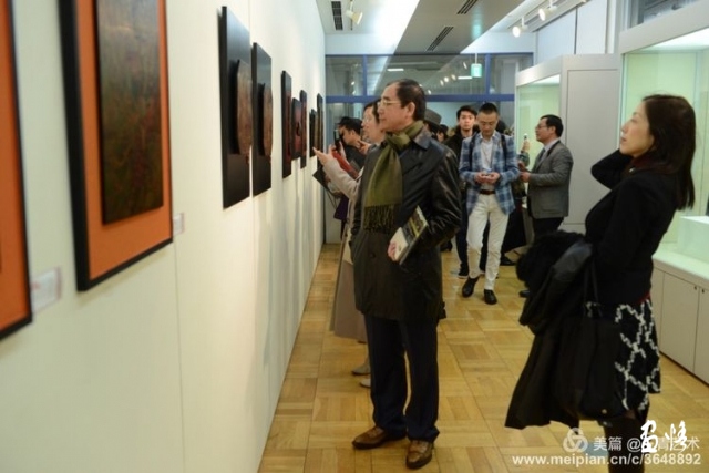周榕清教授在答謝致辭中,首先感謝各位來賓在百忙之中參加周榕清漆藝展party,感謝藝大漆藝研究室全體成員支持,感謝長期關(guān)心和幫助周榕清領(lǐng)導(dǎo)和朋友們。有了他們,才能有這次漆藝展覽成功舉辦。本次展覽共有漆藝作品15幅,全部在東京術(shù)大學(xué)創(chuàng)作完成,一部分是麻胎漆畫,一部分是木板漆畫兩類。表現(xiàn)以"絲路妙音"為主題。作品受到絲綢之路上壁畫構(gòu)成影響,以穿越時(shí)空妙音鳥(迦陵頻伽)為形象特征。妙音鳥來源于古印度的神話傳說,它借鑒了古希臘神話中有翼神——天使的某些形象特征,是印度神話、希臘羅馬神話相結(jié)合的產(chǎn)物。它的嘴上有七個(gè)音孔,通過每個(gè)音孔,能發(fā)出不同的單音,隨著季節(jié)變化,它便吹奏不同的曲調(diào)。美妙動(dòng)聽,抑揚(yáng)頓挫。它色澤亮麗,體態(tài)輕盈,是具有神性的吉祥之鳥,穿著翠綠色的羽毛,四處傳播夢想的種子。
