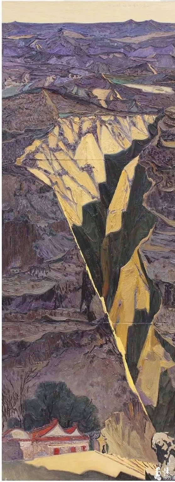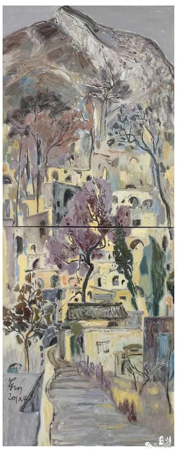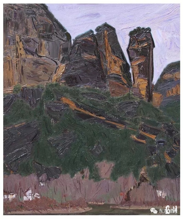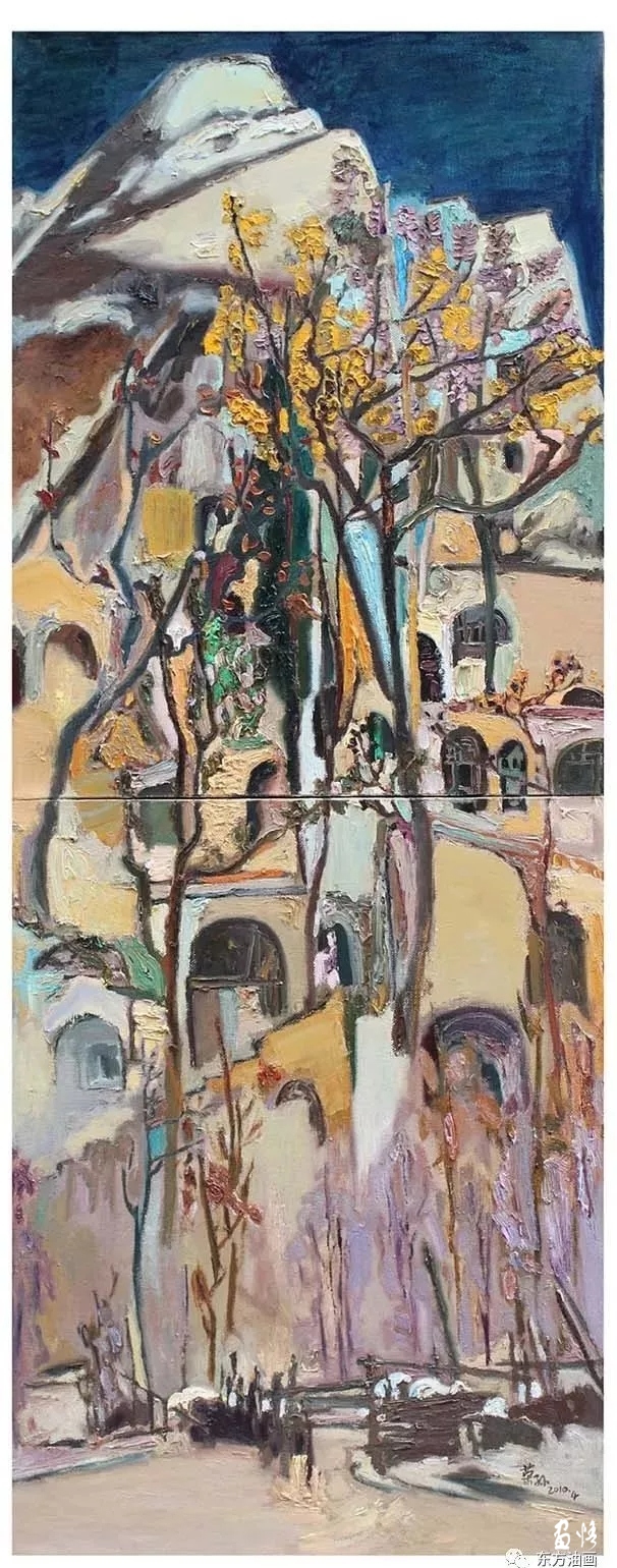 在造型處理上,所畫出的形象要真實(shí)可信,有自然原型,但并非照抄照描自然物象。將客觀的自然變成胸中自然,把胸中自然變成畫布上的自然,注意“神遇”、“跡化”的過程。將自然形象轉(zhuǎn)化為具體的繪畫語言,少些物象的概念,多些繪畫語言自身的抽象性元素,同時(shí)被轉(zhuǎn)化為繪畫語言的形象又必須有自然物象本身的特點(diǎn)。讓每個(gè)形既生動(dòng)自然又各富特征,表達(dá)出最有意思的東西。盡量讓每個(gè)形會(huì)說話,物象與物象之間有交流。在具體形象組織上,從局部到整體都要注意畫面關(guān)系的需要,如窯洞的處理,是根據(jù)山樹之間的關(guān)系,將窯洞安排其間,每個(gè)窯洞都是具體的,大小、形狀、虛實(shí)同樣根據(jù)畫面節(jié)奏而定。以窯洞為主強(qiáng)調(diào)窯洞弱化整個(gè)房子的感覺,房子的結(jié)構(gòu)是被肢解后再重新組織的,這點(diǎn)上吸收立體派的一些造型原理,使得畫面具有些現(xiàn)代造型的元素。在用筆造型上,追求形、色、筆觸、肌理相結(jié)合。盡量用寫的方式,注意占色的次序,顏料盡量少的放在調(diào)色板上調(diào)和,盡可能在一筆畫下去讓色彩豐富而且和形結(jié)合,運(yùn)筆或快或慢,顏色或厚或薄都力求一次完成。