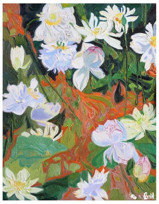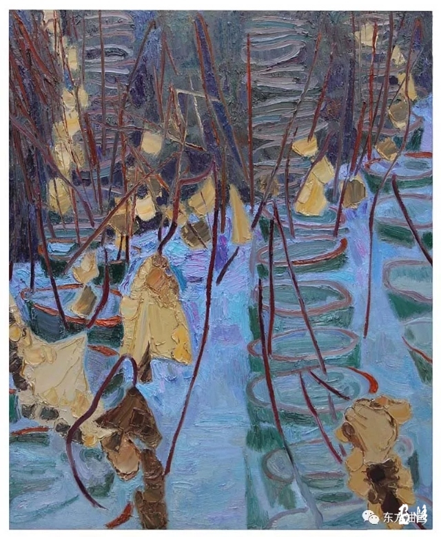 在肌理的處理上,用筆的方向、快慢,顏料的厚薄、干濕,粗糙與光潔等,都根據(jù)自然物象本身的特征將視覺感受和心理感受結(jié)合畫面的具體需要來處理。強(qiáng)調(diào)體現(xiàn)油畫材料的特質(zhì)所產(chǎn)生的特有的肌理效果,同時(shí)注重畫筆、刮刀等工具在塑造肌理上的作用。