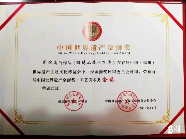 周榕清大師作品《錦繡土樓八百年》獲得首屆中國世界遺產(chǎn)金獅獎(jiǎng)金獎(jiǎng)。