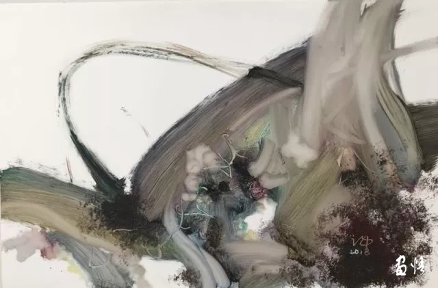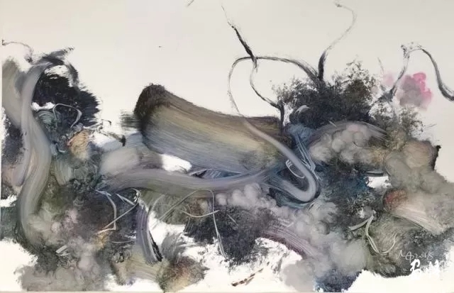 初見這些作品,筆觸扭轉(zhuǎn)翻騰,纏繞糾結(jié),但又如同天地之間流轉(zhuǎn)的“氣”,無形的交織穿插,絲毫不覺一點(diǎn)的阻塞之感,心里不禁想起莊子《逍遙游》中那句“野馬也,塵埃也生物之息相吹也”。凝視之下,甚至?xí)谶@些抽象筆觸的運(yùn)動中隱約感受到那“玄之又玄”的“道”的存在。