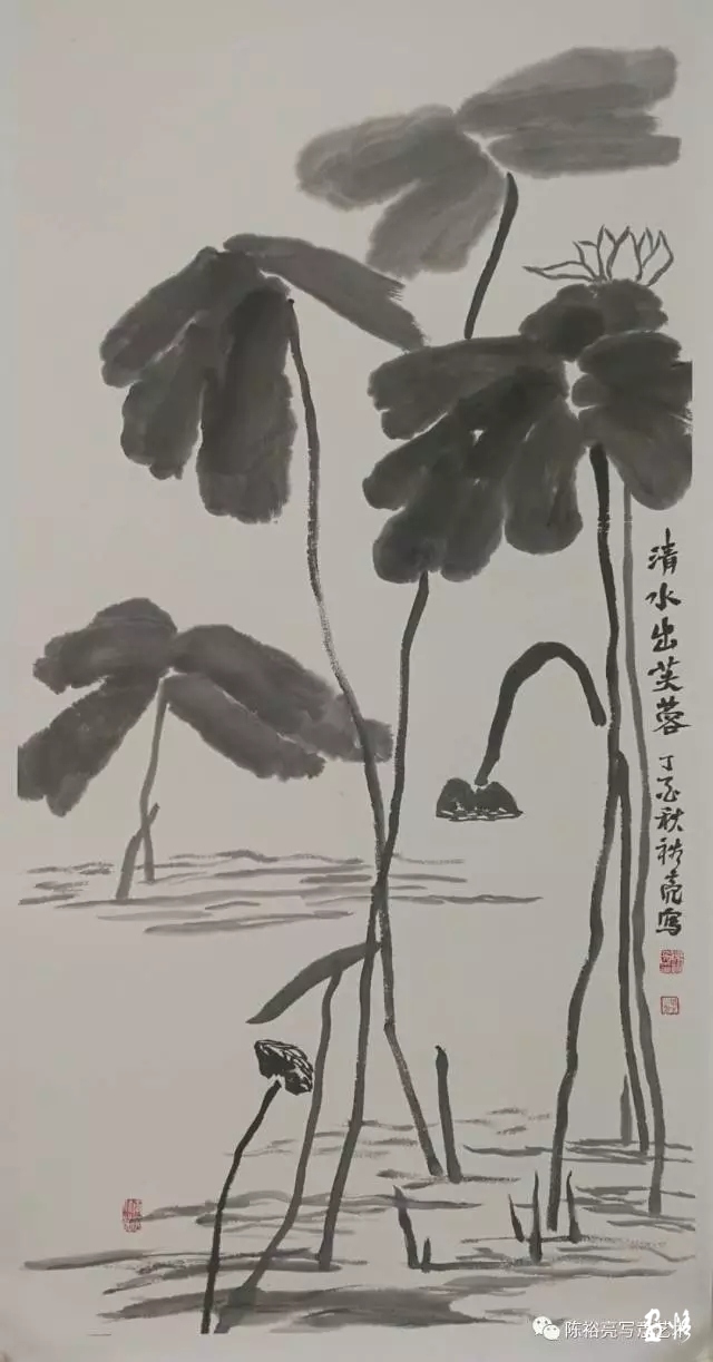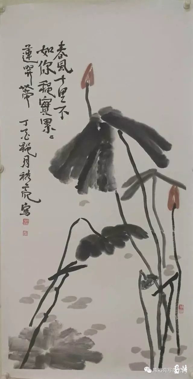 縱觀陳裕亮的藝術經歷與創(chuàng)作,就會發(fā)現(xiàn)他注重文化學養(yǎng)的積累,對傳統(tǒng)經典深入研讀,汲取滋養(yǎng)了文化胸襟,從而形成了他人生藝術坐標,扎根民族文化基礎,把握新時代的脈搏,在浮躁喧囂中保持一份睿智冷靜,是一位有志于復興中華名族文化的人所具有的的擔當。他的荷畫給人的第一印象是舒朗而大氣,干凈又空靈,他繼承了歷代文人畫求詩味講意境的傳統(tǒng),用技上卻又不乏獨有的筆墨追求。他用筆堅毅而不雜亂,且厚重古樸,使所畫荷氣盎然意深而境遠,由古取類而化出,不乏古韻卻有時代新風,他強調的通靈詩情畫意。在我看來,衡量一個人的文化藝術成就,不僅要看他自身的修養(yǎng)成就,更要看他如何為社會為民眾提供有價值的思想和精神產品。裕亮的荷花枝干剛勁有力,厚實挺拔,形式感突出而鮮明,與很多畫家筆下的荷花相比,裕亮筆下的荷花更有堅強旺盛的生命力,在枝葉簇擁中顯荷花亮麗風骨。
