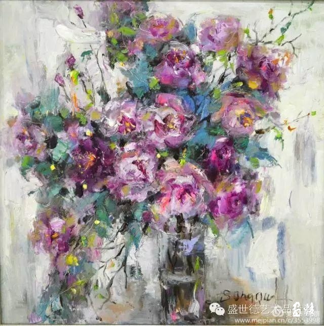 眼前的丁香,催著我拿起畫筆,畫由心生,寫意著這魅惑的紫,這成熟而深沉的紫。想用畫筆留住她的清純與美麗,她的溫婉與含蓄。 跳躍的筆觸在淡香的空氣中流動,斑斕的色彩,凝練的線條,薄厚有序地構(gòu)建著一個獨一無二的丁香花的世界。她在畫布上安靜的笑著,笑容里,溢滿了對生命的尊重與崇敬。而此時的情感也會沾著春的生機(jī)融入畫面。