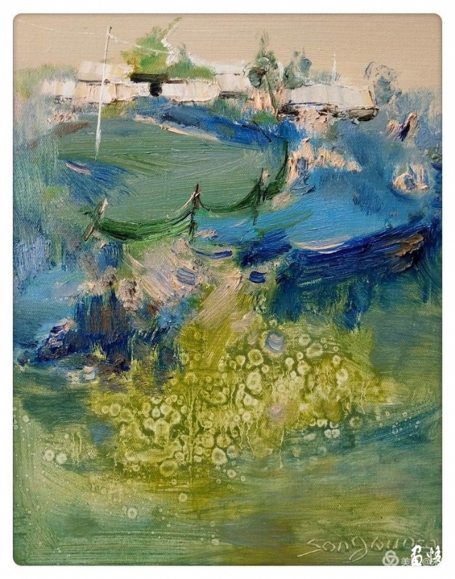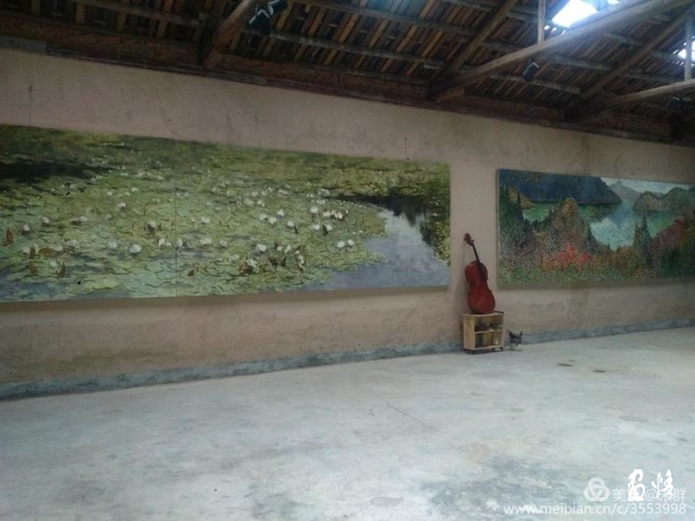 極具特色的畫(huà)室、展廳與長(zhǎng)廊,仿佛把一切都準(zhǔn)備好了,迎接著我們這些遠(yuǎn)道而來(lái),為了心中那份執(zhí)念而鐘愛(ài)藝術(shù)的朋友。展廳的作品,與這山這水交相輝映。一幅幅深沉含蓄,充滿真情的作品,讓我的思緒隨著畫(huà)面的音律、節(jié)奏、延伸跳躍。一幅6米x1,8米的睡蓮,抓住了我的視線。如此大的畫(huà)面,整體把控如此之好令人敬佩。畫(huà)面結(jié)構(gòu)嚴(yán)謹(jǐn),疏密有序,用筆繁而不亂。杜老師仿佛是一位歌者,一個(gè)個(gè)小小的筆觸好似一串串小小的音符,以其特有的表現(xiàn)形式,呈現(xiàn)著它的美感。這些元素柔美地繾綣在一起,有節(jié)律地彈撥著一首動(dòng)人心弦的《睡蓮曲》。