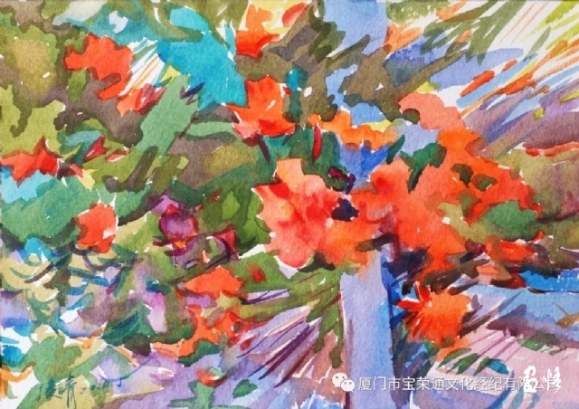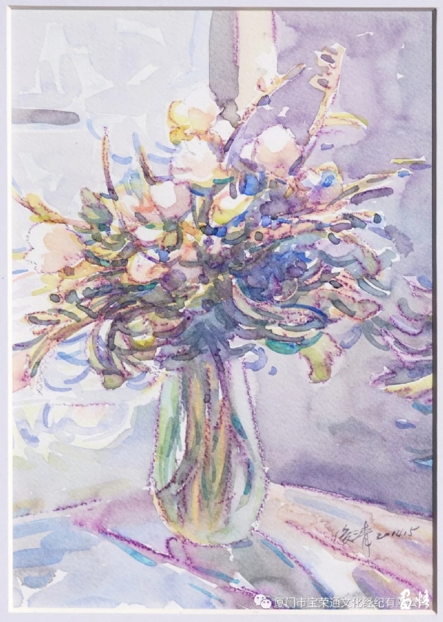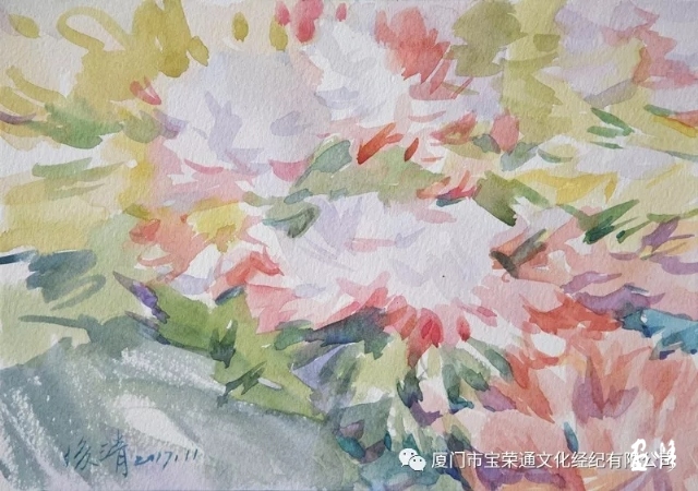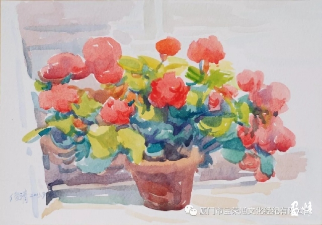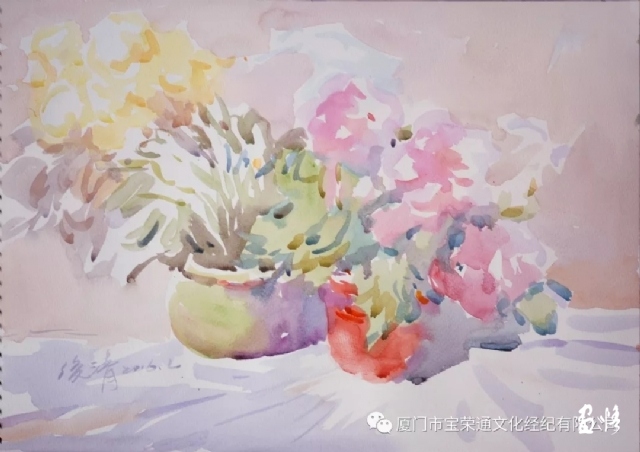 乙未初秋有幸結(jié)識俊清兄,每每相聚,皆以茶代酒論道品藝??∏逍譃槿颂幨乐t卑得體、儒雅灑脫。平日切磋,便是意見相左,也無面紅耳赤之態(tài),談吐之間,見文人風(fēng)骨。令我深感敬佩之處,是其繁重教務(wù)工作之余,尚能潛心專研水彩藝術(shù)。孜孜不倦地探索與追求,是多年來俊清兄對水彩畫賦予的極大熱愛,以其對于藝術(shù)獨特理解、廈大導(dǎo)師們多年熏陶,加之綜合學(xué)科優(yōu)勢影響,令其在水彩畫藝術(shù)上獨辟蹊徑,其水彩畫有別于常人,畫風(fēng)脫俗,固守本心?!熬葡悴慌孪镒由睢保忍斐驳睦L畫天賦加以后天持之以恒的勤奮,俊清兄的畫終散發(fā)出藝術(shù)芬芳,沁人心田。