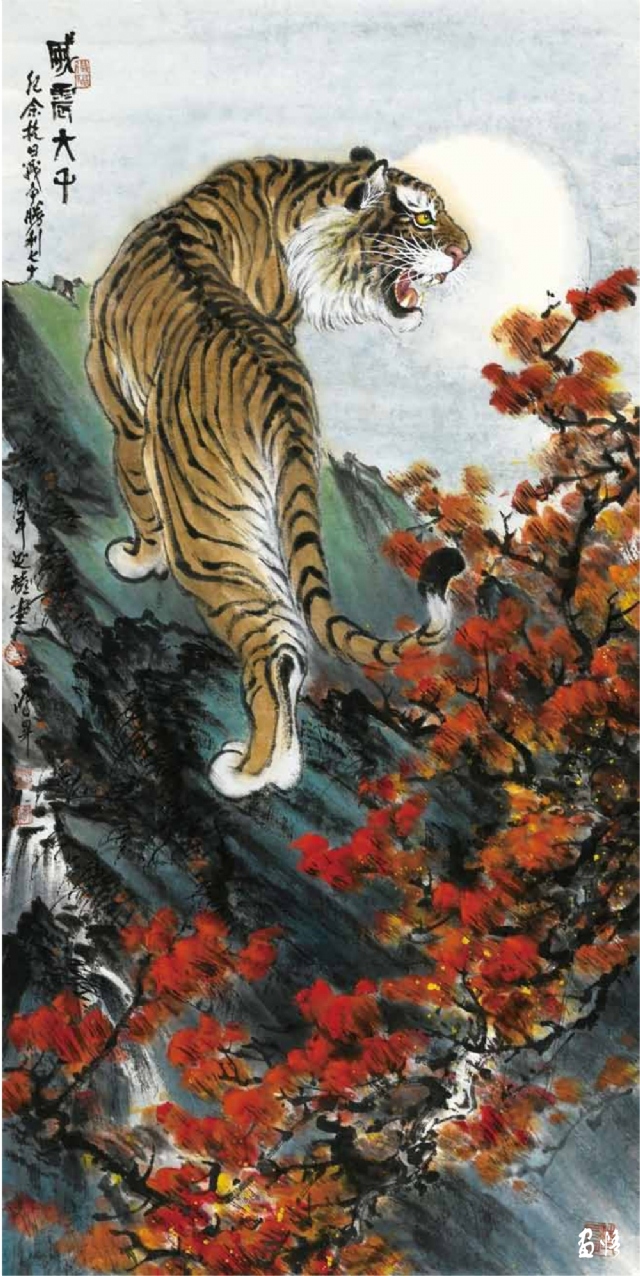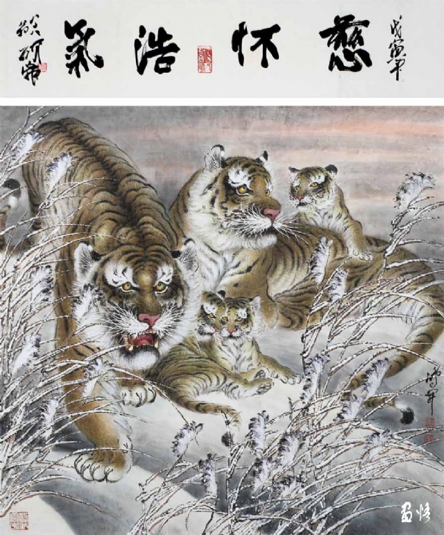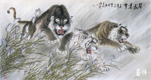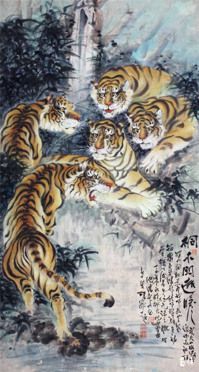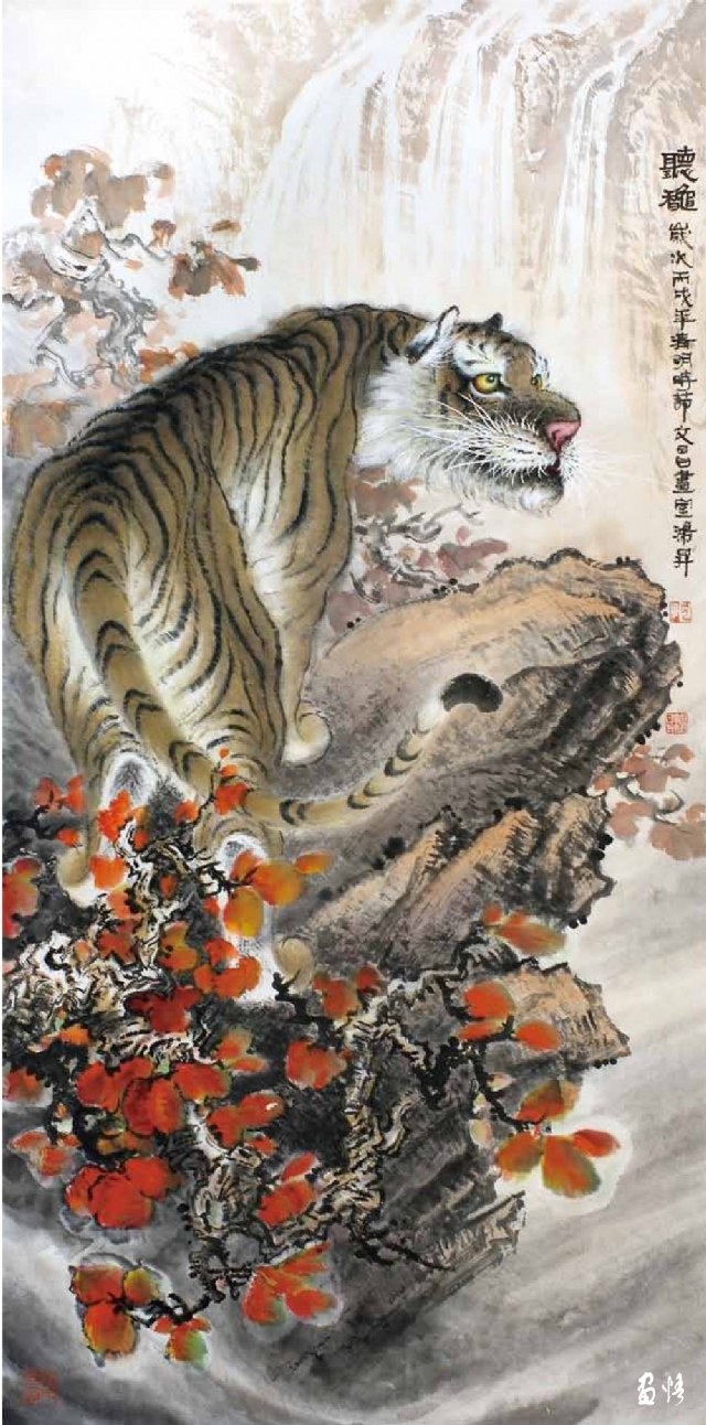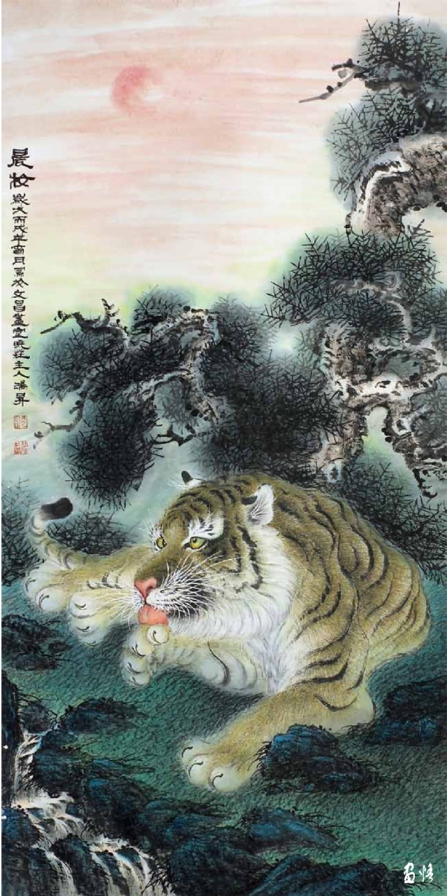 由于工作所累,喜歡畫畫的鴻昇,還不能專門從事繪畫創(chuàng)作,不得不在勞動、訓(xùn)練、工作之余才能拿起畫筆。直到退休,放下了各種俗務(wù),他終于成為“專職”畫家,可以專心畫畫了。回顧他的創(chuàng)作歷程,木刻、工筆、寫意,花鳥、人物、山水他都有所涉獵。在詔安畫壇早早地以畫虎出名,所畫老虎或在山林云水間盡情奔騰狂嘯,或閑庭信步,或傲視茫茫云海。畫家筆下的老虎,富有情感而又充滿驍健和自然的活力,令人精神振奮。