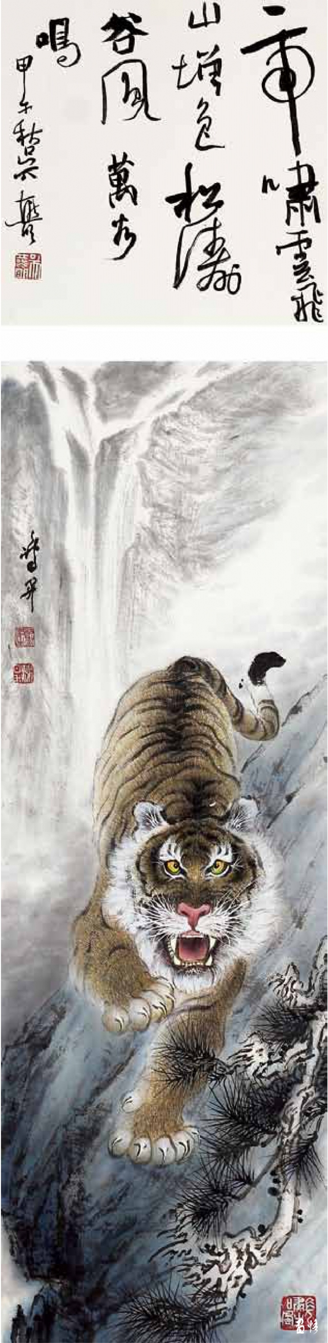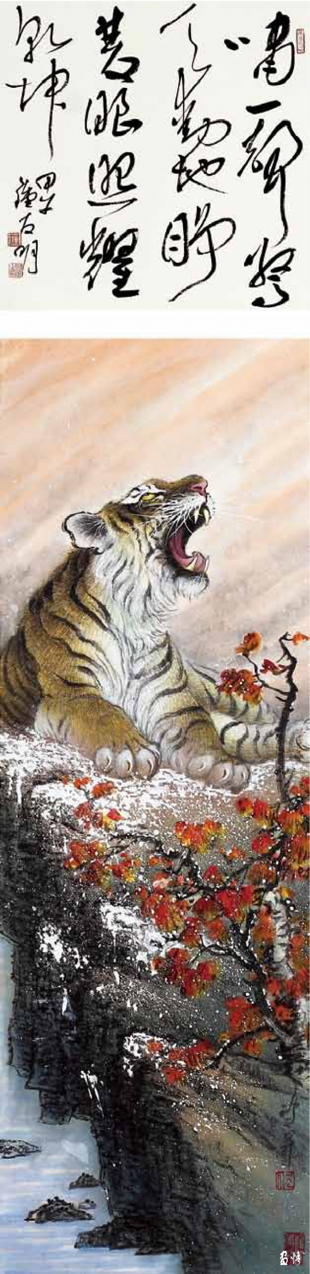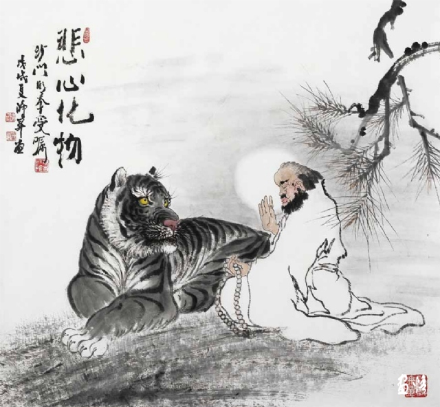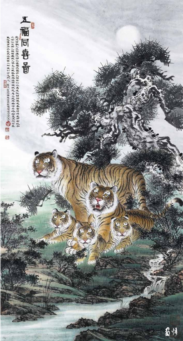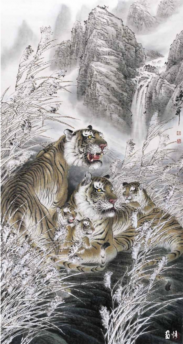 由于工作所累,喜歡畫畫的鴻昇,還不能專門從事繪畫創(chuàng)作,不得不在勞動、訓(xùn)練、工作之余才能拿起畫筆。直到退休,放下了各種俗務(wù),他終于成為“專職”畫家,可以專心畫畫了。回顧他的創(chuàng)作歷程,木刻、工筆、寫意,花鳥、人物、山水他都有所涉獵。在詔安畫壇早早地以畫虎出名,所畫老虎或在山林云水間盡情奔騰狂嘯,或閑庭信步,或傲視茫茫云海。畫家筆下的老虎,富有情感而又充滿驍健和自然的活力,令人精神振奮。