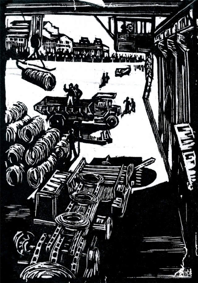 不盡鋼材滾滾來(lái)(黑白木刻)28cm-20cm 1980年