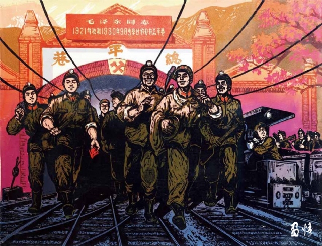 紅色安源大課堂--光輝道路(套色木刻)110cm-34cm 1975年