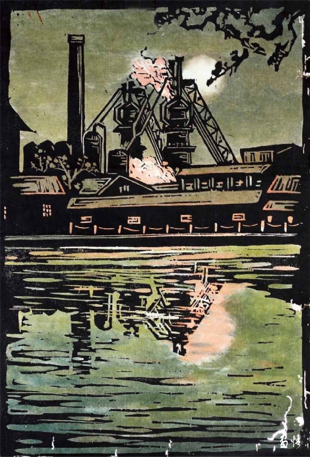 三鋼之夜(水印木刻)30cm-20cm 1980年