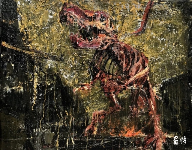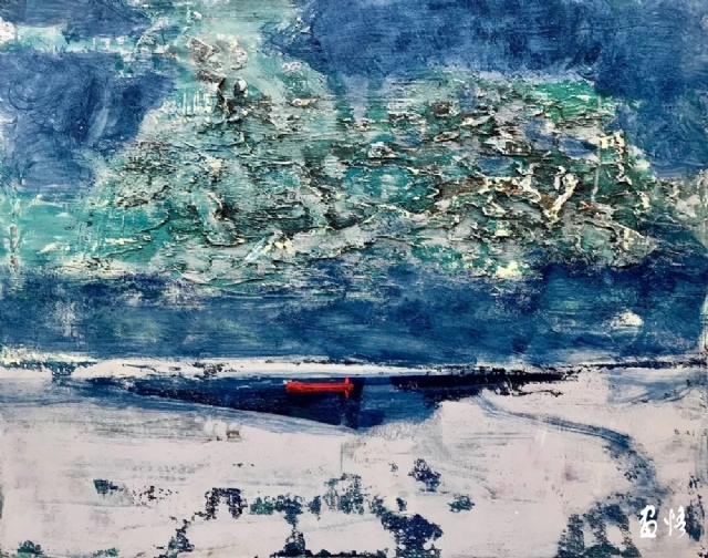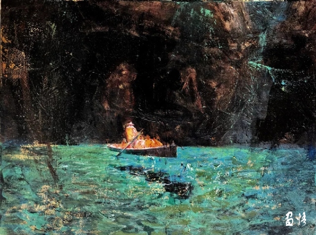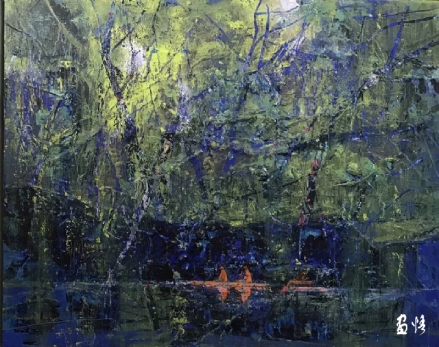 看明華的畫,首先映入視野的,是經(jīng)由自然物像借勢而來的抽象的框架結(jié)構(gòu)。將繁雜繽紛的自然景象進行整合提煉和強化。濃郁、厚重、強烈的色彩和畫面效果。顯示出他對畫面的把控能力和繪畫上的主動性。而他的作品不論大畫小畫都有一種大氣磅礴的氣勢,和格調(diào)不俗的品質(zhì)。這種氣勢首先來自他筆意的書寫性與意象境界的表達;格調(diào)則來自對繪畫本身問題的探索,而非拘泥于對自然的描摹再現(xiàn)。他的“船”系列間于具象與意象的表現(xiàn),很震撼,看后有一種揮之不去的神秘甚至恐懼的感覺!而植物系列則燦爛茁壯,生機盎然,又是一番天地。
