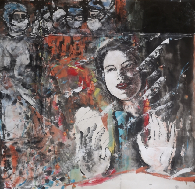 這幅意思是:室外卻是大風(fēng)大雪中醫(yī)務(wù)人員英勇赴漢,舍身取義,我們望向窗外心系武漢,眼中露出祈盼平安的神情,祈盼英雄平安,更等待春天的來臨