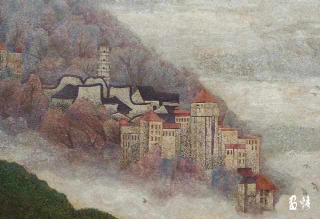 整個(gè)畫面近景以青磚白墻典型建筑和錯(cuò)落有致樹木,給人質(zhì)樸清新、平靜悠遠(yuǎn)的感覺。中景祥云瑞氣,隱約浮現(xiàn)的高層建筑,象征著祖國(guó)改革開放四十年來取得豐碩成果。遠(yuǎn)景青山鐘靈毓秀,水天一色。它以明亮輕快暖色調(diào),給人視野開闊深遠(yuǎn)、自然大氣的感覺。讓人情緒的疏緩放松。