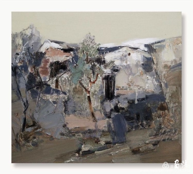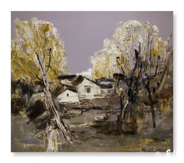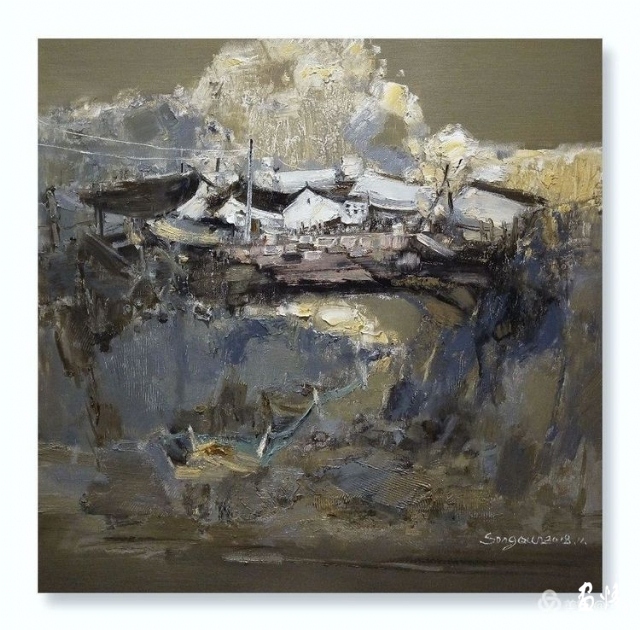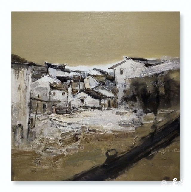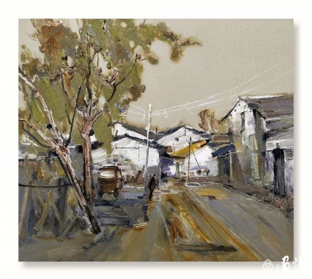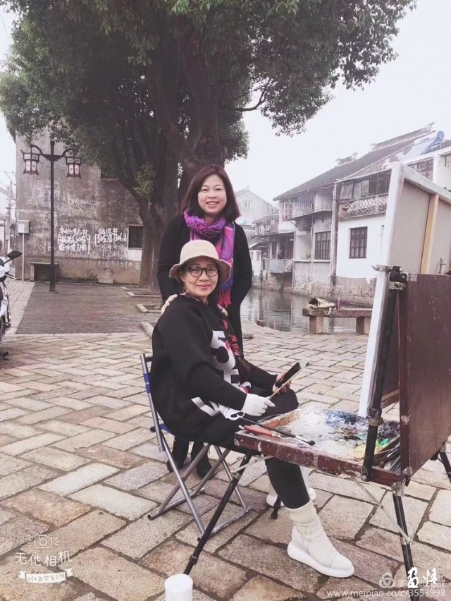 橋多,水多,巷多,古宅多,名人多是甪直的特色。我們住在蘇州甪直寫生基地,這是個(gè)很溫暖的地方。我的房間臨水而居,出得門來就可以畫畫,畫箱支在水邊,心中設(shè)計(jì)著畫面。一彎橋和黑白相間的房屋迎面撲來,順理成章地成為了我畫面的視覺中心。迅速落筆,要把眼前的婉約之美,收藏于我的畫布之上。