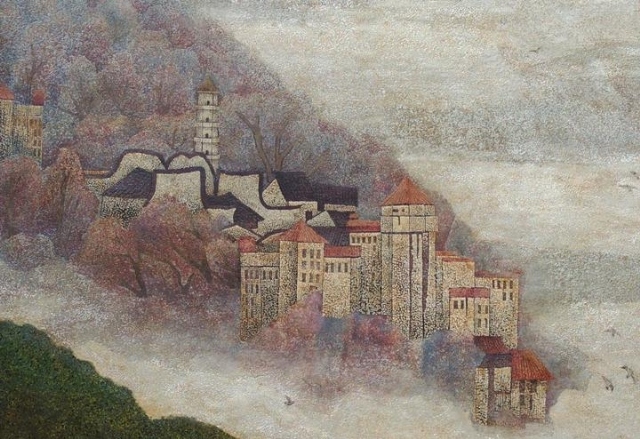 畫家注重自然景觀與漆藝術(shù)的結(jié)合,在作品中通過景物中的樹和建筑以及祥云之間前后遮掩的啟承轉(zhuǎn)合,形成了錯(cuò)落有序的遠(yuǎn)近空間感,構(gòu)成景物間微妙而和諧的關(guān)系,以及豐富變化的自然形態(tài)。