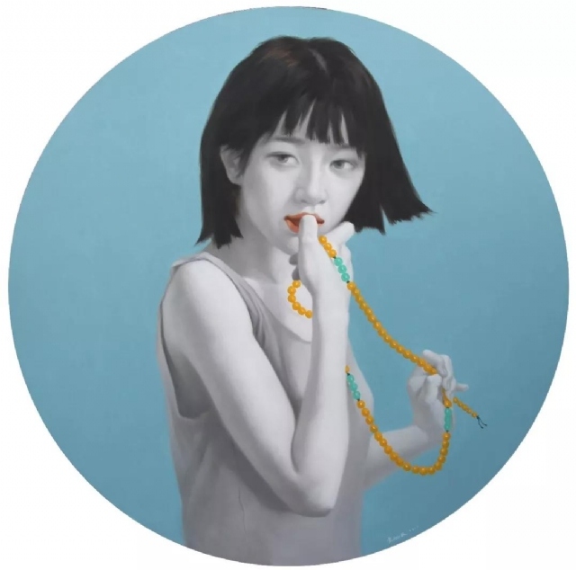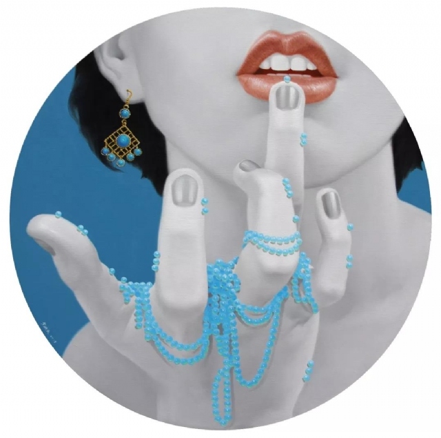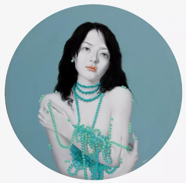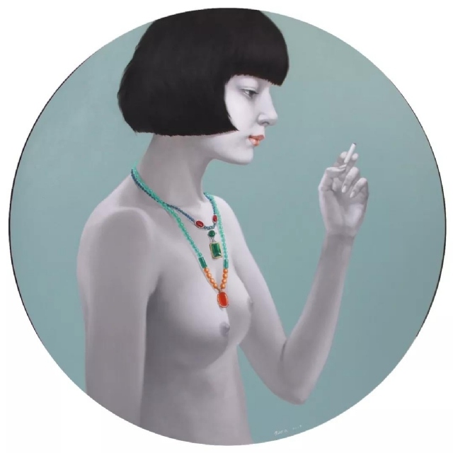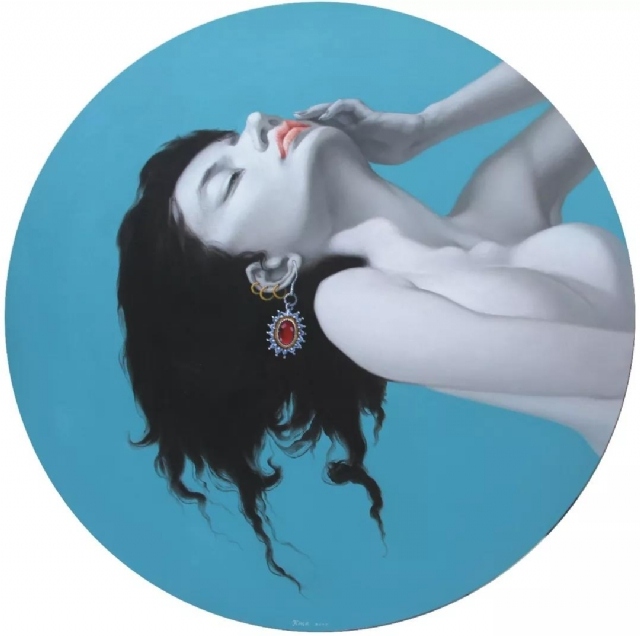 在這一藍(lán)版系列作品里,藍(lán)色她是幻想積極的一面,她象征著烏托邦式的遙遠(yuǎn)。藍(lán)色她來自于遙不可及的天空,把藍(lán)色從天上騙下來,置于畫面與銀灰色的人物相伴,在現(xiàn)代工業(yè)社會(huì)里銀灰色是一種冰冷的金屬物,而在沒有時(shí)限的顏色里,一種寧?kù)o的冷艷,讓我們之間產(chǎn)生一種隔著空氣的距離感。