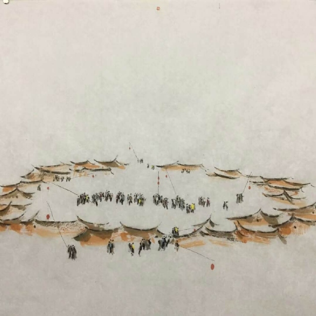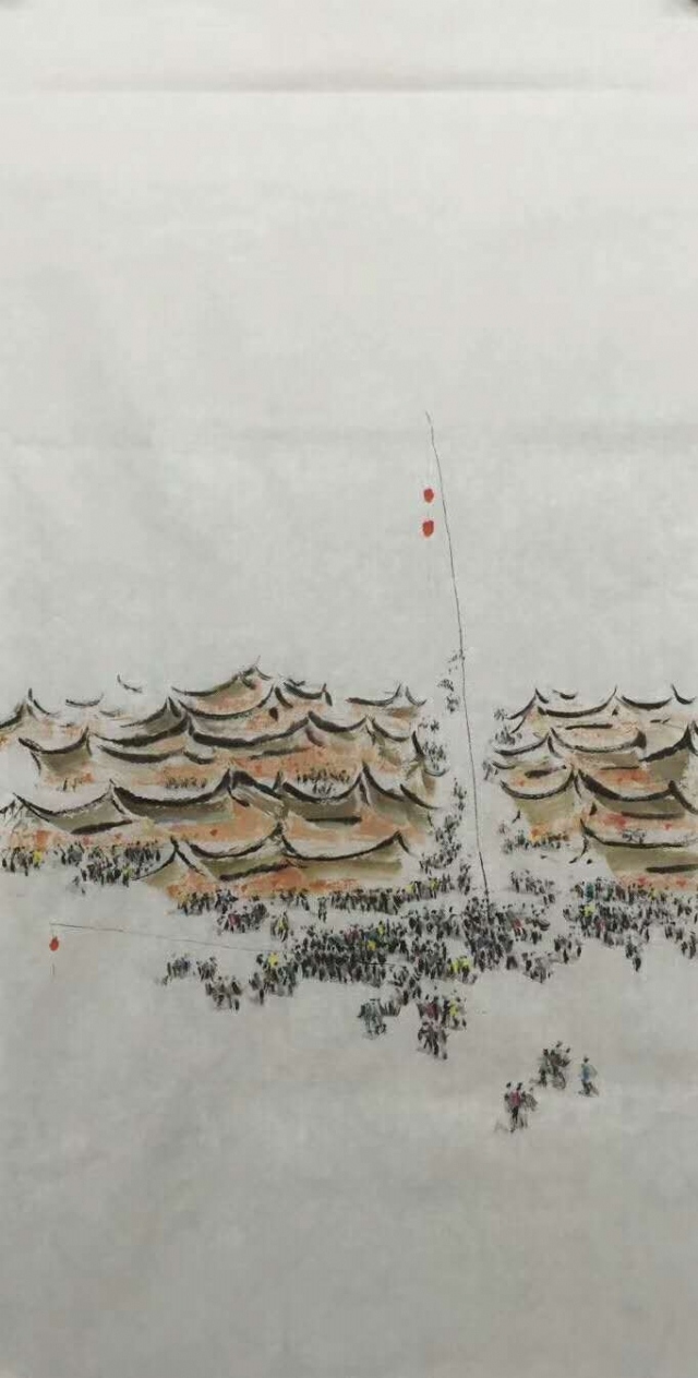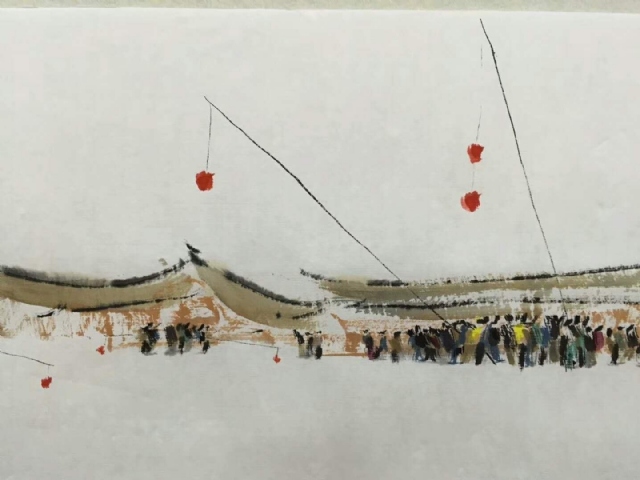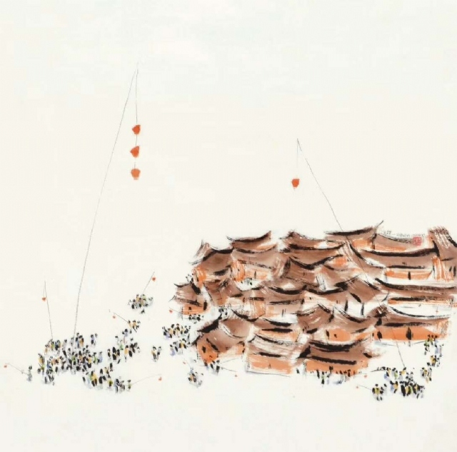 《古城戲燈》紙本水墨