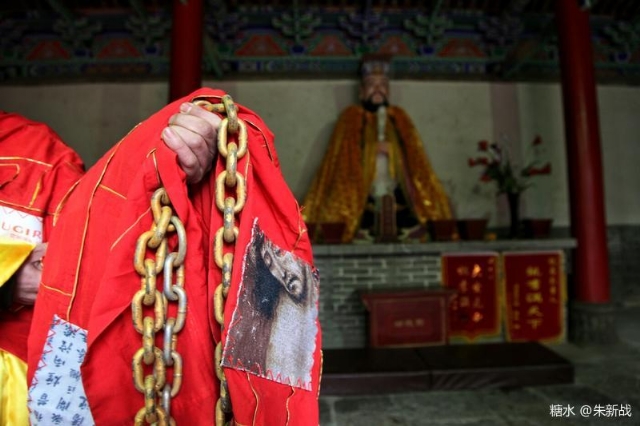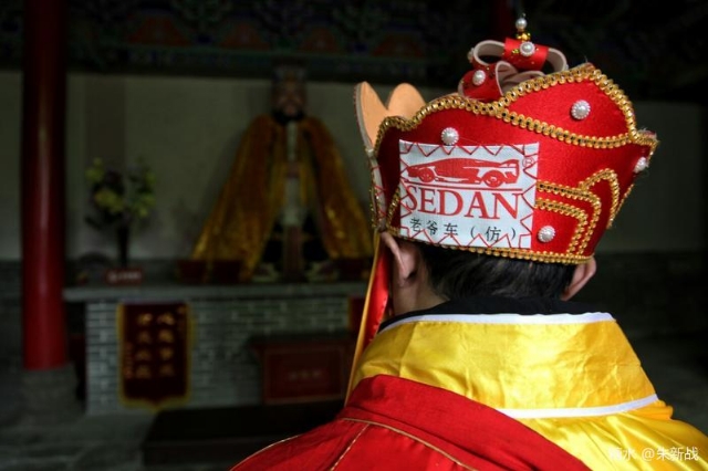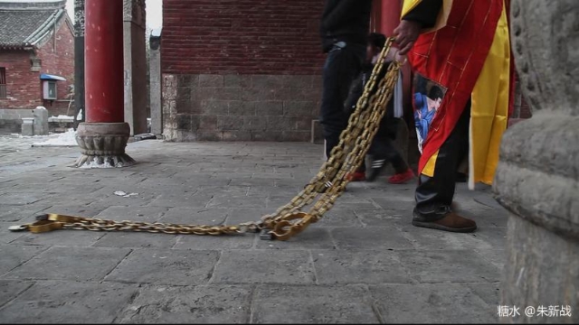 所以,朱新戰(zhàn)以一種矛盾的,沖突的畫面來體現(xiàn)這種人的生存與思想之間的矛盾性,穿上打著西方品牌和藝術(shù)碎片補(bǔ)丁的袈裟,手中拖著黃金鎖鏈來到了儒家精神圣地“孔子書院”。你看到的會(huì)是一種怎樣的藝術(shù)表達(dá)內(nèi)涵?是佛家向儒家的敬仰,還是佛家要拉著至圣先師一起下地獄?當(dāng)代藝術(shù)用一種不確定的畫面語言來引導(dǎo)你自己去看,而不對(duì)藝術(shù)作過度的詮釋去剝奪觀者自由思考的權(quán)利,你能看到什么,想看到什么,由你自己來決定。