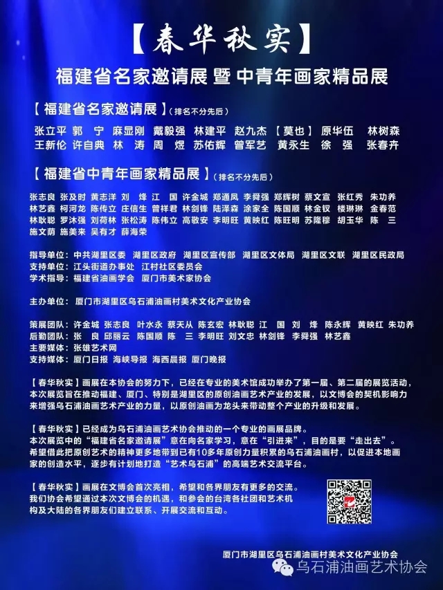 全部作品在廈門會展中心的"第九屆海峽兩岸文博會"上展覽,展覽位置:A4T14【藝術(shù)烏石浦】春華秋實畫展,展覽時間;11月4-7日,8:30-17:00.