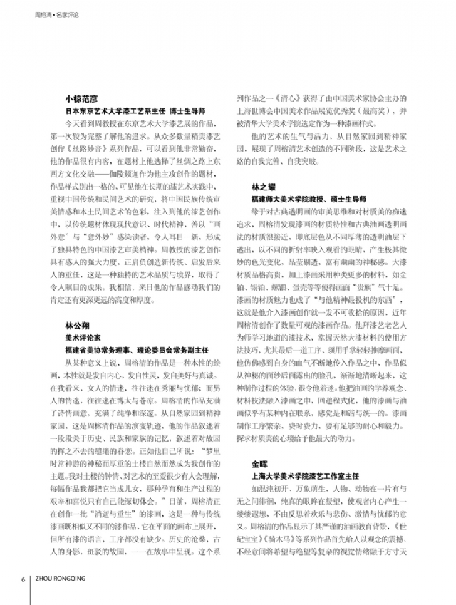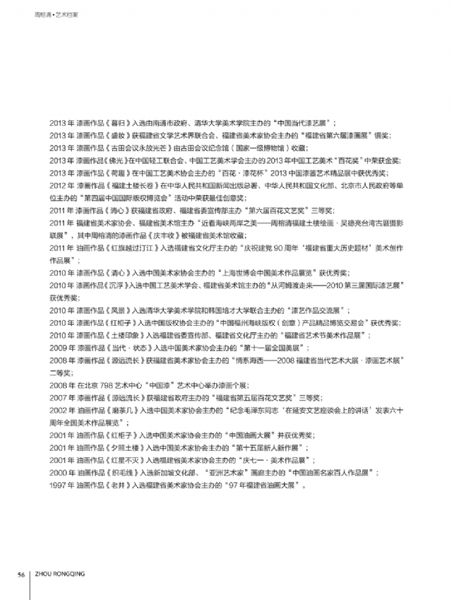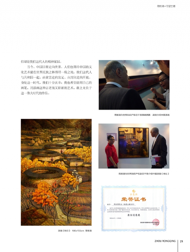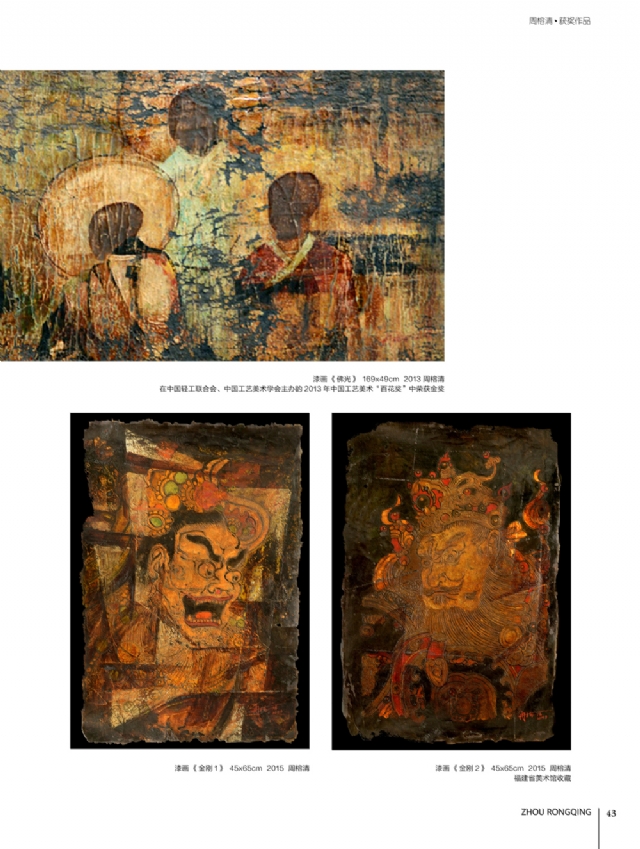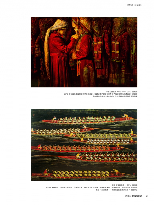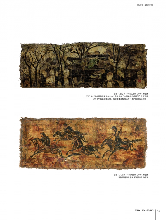 歷時多年的沉淀,我的這本畫冊《東方收藏一周榕清漆藝術??方K于問世了心中不免如釋重負。記得小學時,我的處女作《農(nóng)家大肥豬》被老師貼到當時家鄉(xiāng)最繁華電影院的櫥窗里,當我把這一消息告訴家人和同學時,那種滿足感和成就感至今令人回味,也許從那時起我就與畫畫結下不解之緣。上大學以后,對故園的深切眷戀,使我不知不覺又拿起畫筆描繪家鄉(xiāng)的山山水水和那樸實、善良的人們夢里時常神游的神秘而厚重的土樓自然而然成為我創(chuàng)作的主題。記得我在上大學三年級時,對中國民間漆藝有著濃厚的興趣,特別喜歡福州脫胎漆器上的大漆高貴質(zhì)感和表現(xiàn)力,因此白天上油畫班的課程,晚上偷偷自學漆畫,隨著時間的推移,漸漸地被大漆“如漆似膠”的“粘住了。因此也由對油畫的興趣逐步轉(zhuǎn)移到漆畫創(chuàng)作上。