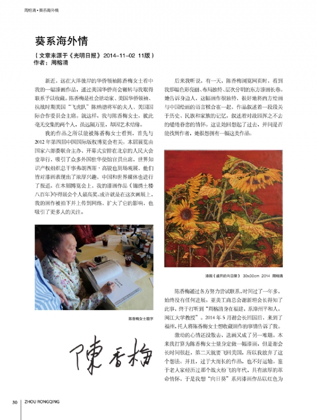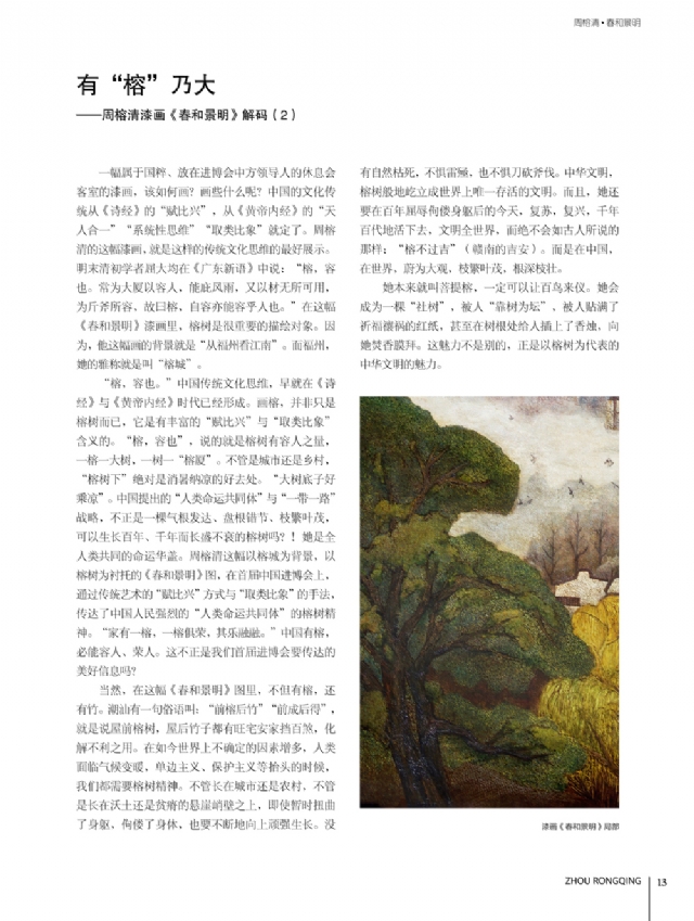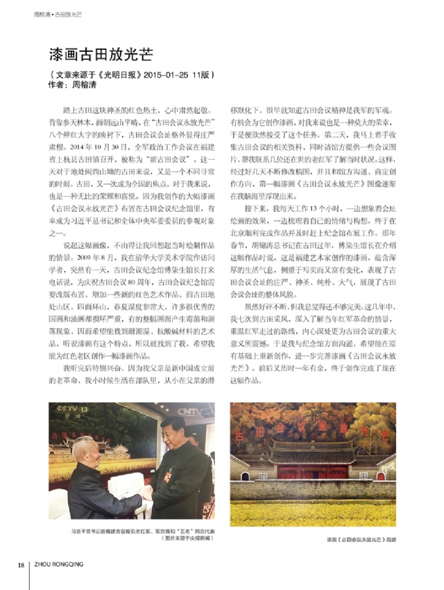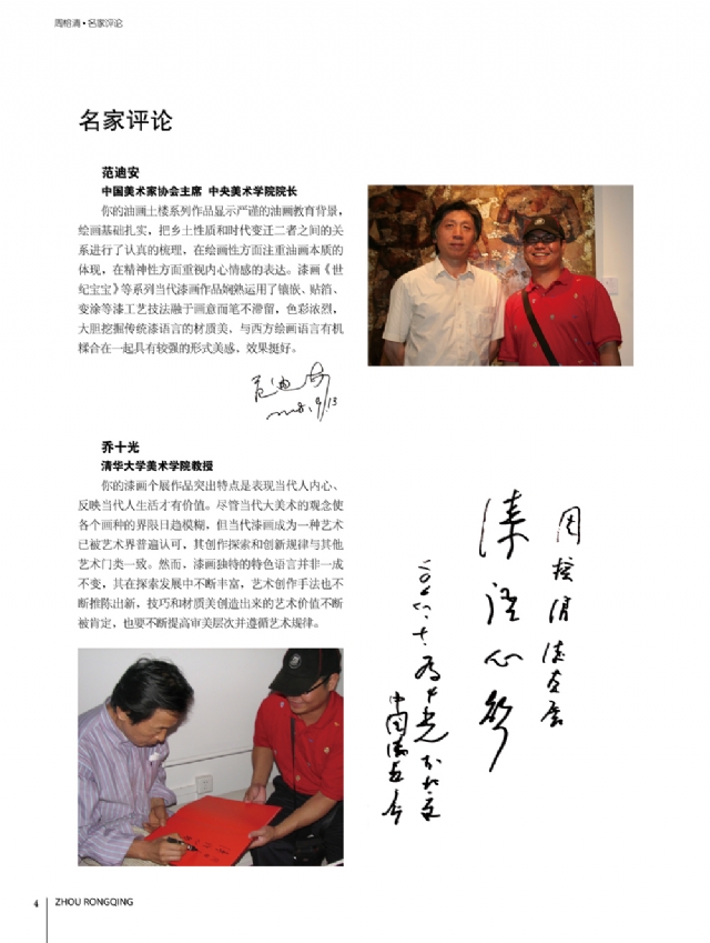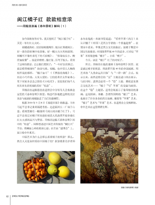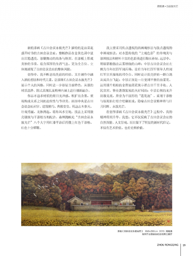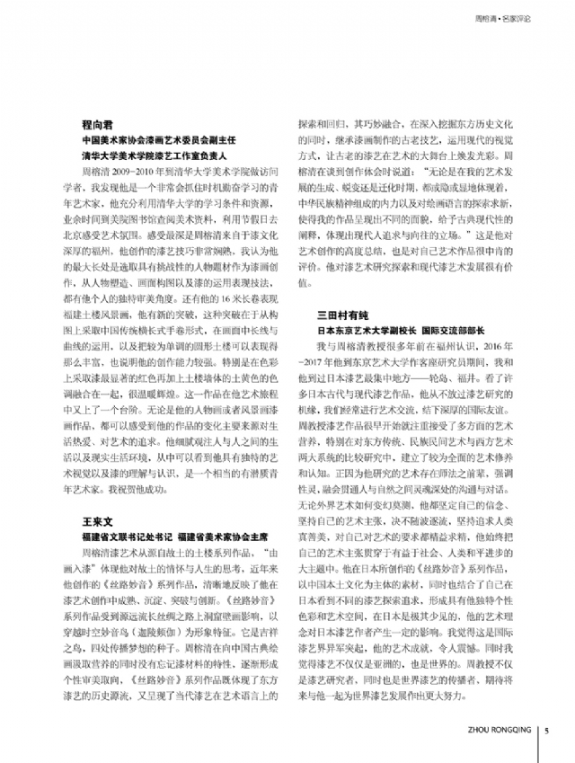 歷時多年的沉淀,我的這本畫冊《東方收藏一周榕清漆藝術??方K于問世了心中不免如釋重負。記得小學時,我的處女作《農(nóng)家大肥豬》被老師貼到當時家鄉(xiāng)最繁華電影院的櫥窗里,當我把這一消息告訴家人和同學時,那種滿足感和成就感至今令人回味,也許從那時起我就與畫畫結下不解之緣。上大學以后,對故園的深切眷戀,使我不知不覺又拿起畫筆描繪家鄉(xiāng)的山山水水和那樸實、善良的人們夢里時常神游的神秘而厚重的土樓自然而然成為我創(chuàng)作的主題。記得我在上大學三年級時,對中國民間漆藝有著濃厚的興趣,特別喜歡福州脫胎漆器上的大漆高貴質(zhì)感和表現(xiàn)力,因此白天上油畫班的課程,晚上偷偷自學漆畫,隨著時間的推移,漸漸地被大漆“如漆似膠”的“粘住了。因此也由對油畫的興趣逐步轉(zhuǎn)移到漆畫創(chuàng)作上。