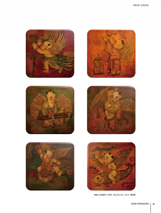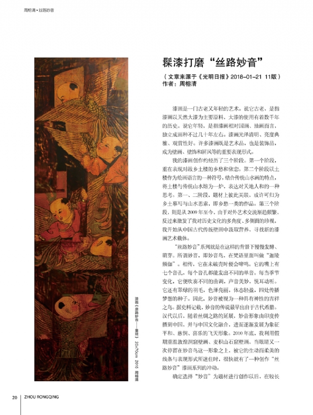 我的漆畫創(chuàng)作,約共經(jīng)歷了三個階段。第一個階段,是從1993年至2006年,重在表現(xiàn)對故鄉(xiāng)土樓的鄉(xiāng)愁、依戀。第二個階段,是從2005年至208年,以土樓作為繪畫語言一種符號,結合傳統(tǒng)山水畫的的特點融合一起,表達我對天地人合的一種思考,代表性作品如《禪意山水系列》。第一、第二兩個階段,題材上相承相連,或許可以歸為種鄉(xiāng)愁作品,即鄉(xiāng)士的摹寫和山水的思索。第三個階段,則是從20年至今。由于對外藝術交流漸趨頻繁,反過來激發(fā)了我對歷史文化的多角度多側(cè)面的重新認識,我開始從中國古代傳統(tǒng)壁畫中汲取營養(yǎng),尋找新的漆畫藝木載體,用自己的漆畫創(chuàng)作對這天、地、人的思考進行著詮釋。從源自故十的《土樓》系列鄉(xiāng)愁作品,到最新創(chuàng)作的《絲路妙音》系列作品,可以看出在占今中外文化的影響下,我的藝術創(chuàng)作中不斷否定之否定,但是對藝術追求對人類精神家回仍然孜孜不倦地守望。激情所至,二十幾年來我?guī)缀趺刻煸绯鐾須w,有時為了創(chuàng)作夜不歸宿,甚至連女兒出生、父母生病的時候都無法好好地陪伴左右。我對藝術的鐘情與至愛很少有人會理解,每幅作品我都把它當成兒女,那種孕育和生產(chǎn)過程中的艱辛和喜悅只有自己才能深切體會。如今,終于把它們公諸于眾這就是我對多年來一直支持關心我創(chuàng)作的領導、老師、朋友們的回報和感恩。借此機會特別要還要感謝我的父母、家人以及親人們,沒有他們的理解和支持,我不可能在藝術道路上默默耕耘、勇住直前。