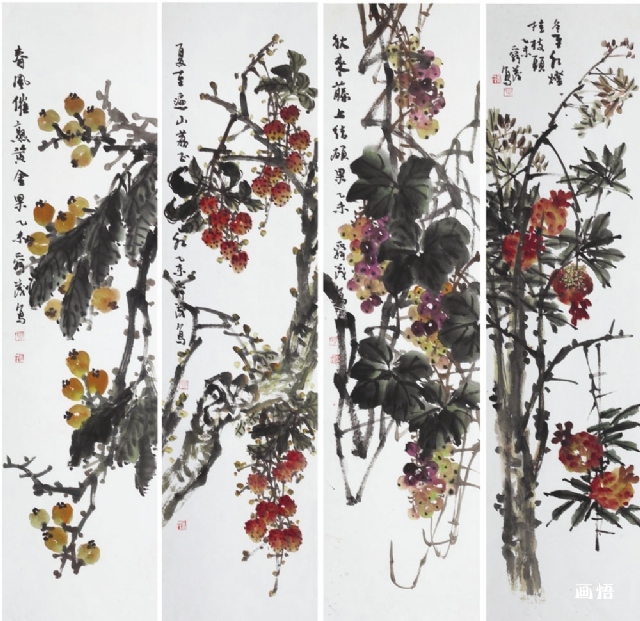 《春風(fēng)催熟黃金果》四條屏