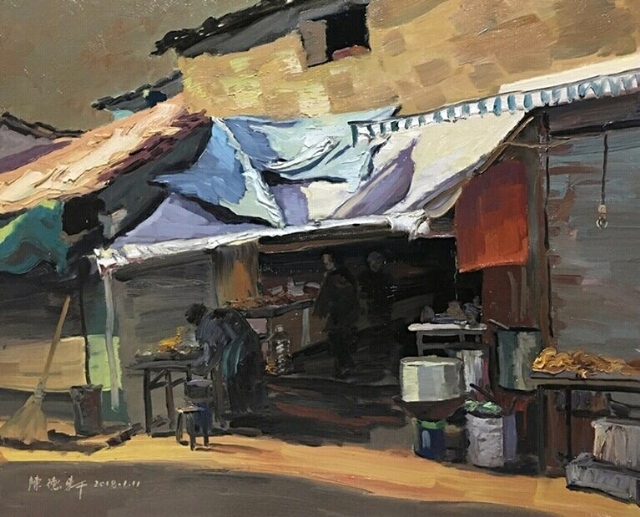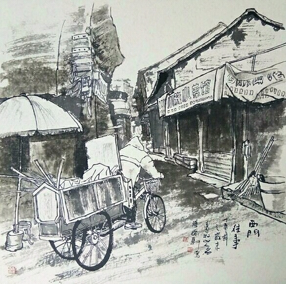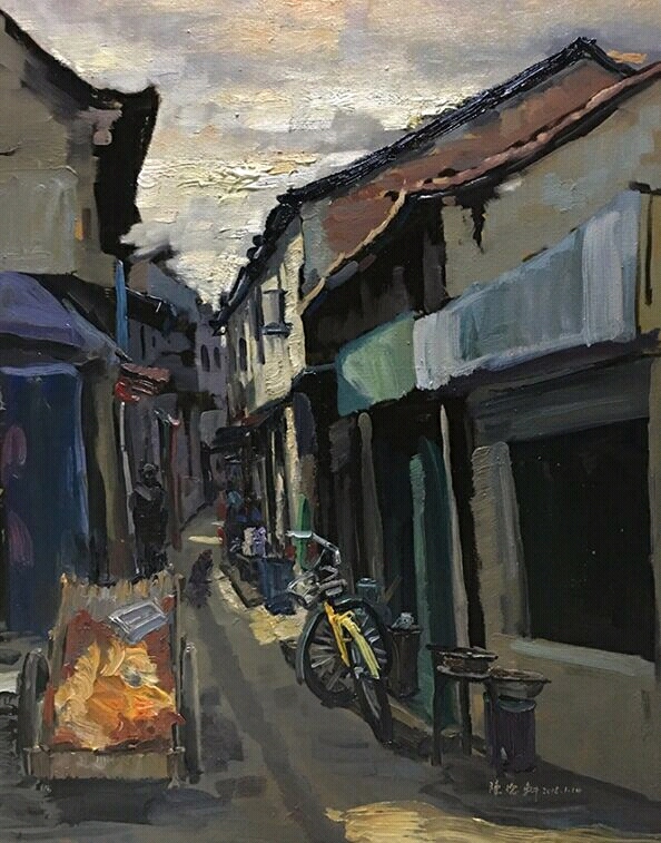 2015年西門街寫生最后一張,我決定畫張大的作品,記得那天我背著沉重的畫箱,拿著巨幅畫布,順著狹窄的小巷來到一處寬闊處,那是一個垃圾堆,臭氣熏天,我借來掃把和水桶,把垃圾裝進(jìn)垃圾桶,垃圾桶挪到一邊,用水和掃把沖洗了三四遍,總算臭味稍減,支起畫箱開始創(chuàng)作。