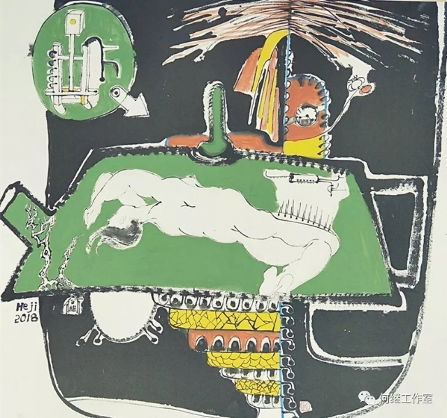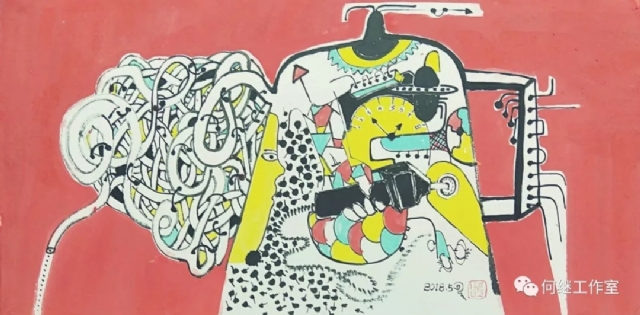 還有一個問題,何繼呈現(xiàn)的東西比較龐雜,因為我是喜歡禪宗的,實際上,我看過何繼的繪畫現(xiàn)場,不是說的是應(yīng)酬,就是現(xiàn)場隨便畫著玩,他從功夫上、造型上、用色上來講都不屬于有規(guī)律有系統(tǒng)的,完全是比較隨意,他這種比較隨意更接近于日常,更接近于自己剎那時間的感受,他現(xiàn)在力度,可能還沒有達到他理想的狀態(tài)。但是我覺得至少從畫面,對繪畫的態(tài)度來講,我覺得他未來走的方向可能更靈動。如果把的畫面承載出很多符號的龐雜,我認為是一種冒險,反過來也說也是一種膽量。像我們做畫畫的人兼并做裝置、行為......缺少這些綜合能力,就意味著藝術(shù)家很難把一件事做精,成名者就更少。國內(nèi)很少有人幾項都能達到統(tǒng)一的高度,能做的人首先要考慮自己有沒有這個能力,即使有了能力剩下就是膽量。何繼這4年有兩個臺階上來,一個臺階是到北京受益了一些,觀念上發(fā)生改變,第二個形成了死守,死守實際上是為了發(fā)力的準(zhǔn)備,自律性增強了,膽量也增強了,身邊的一些藝術(shù)家各個方面也不錯,但我最終覺得,一個人的成就大小與他的膽量有關(guān)系,具有追求冒險的精神,才能繞開經(jīng)驗主義的規(guī)律,這是我近期的一個觀感。