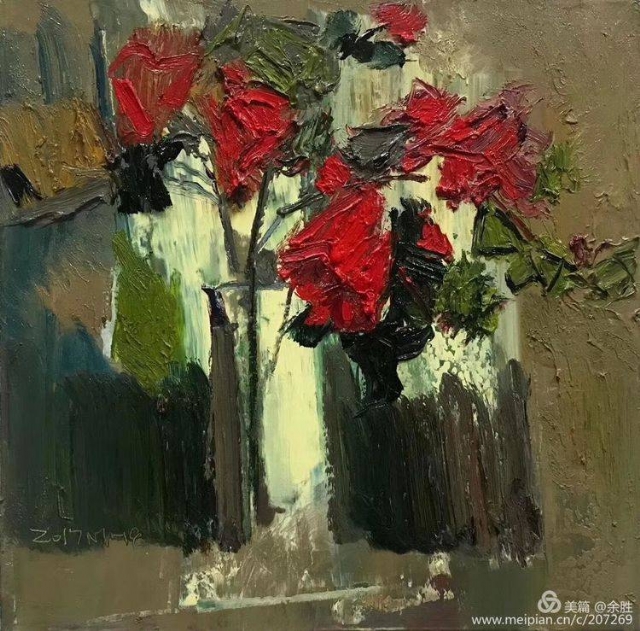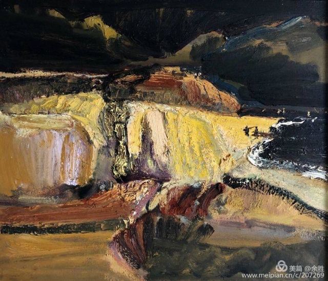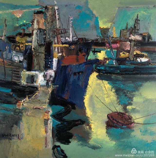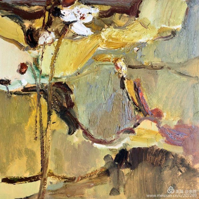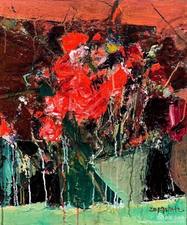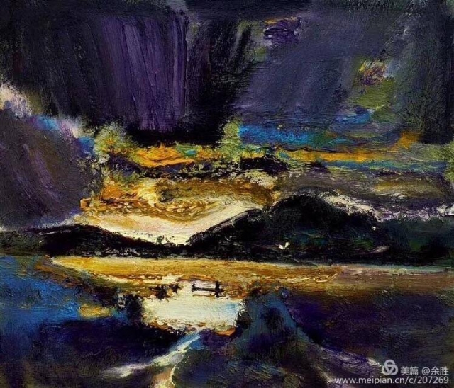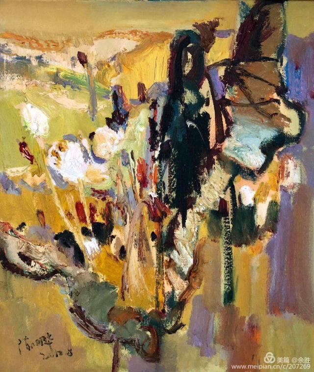 看明華的畫(huà),映入視野的是經(jīng)由自然物像借勢(shì)而來(lái)的抽象的框架結(jié)構(gòu),將繁雜繽紛的自然景象進(jìn)行整理提煉和強(qiáng)化。濃郁、厚重、強(qiáng)烈的色彩和畫(huà)面效果,顯示出他對(duì)畫(huà)面的把控能力和繪畫(huà)上的主動(dòng)性。