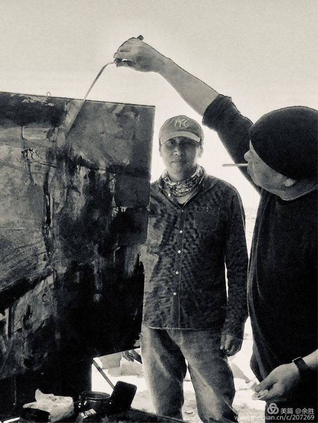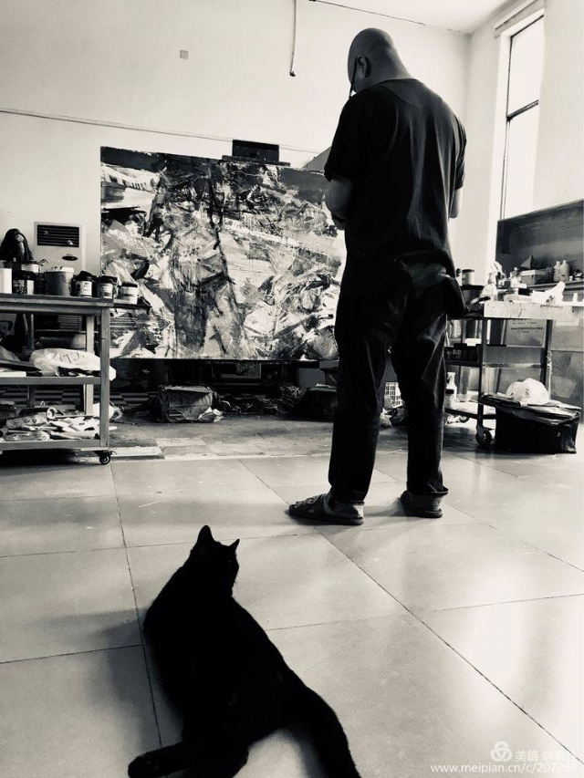 我還注意到,他有兩件作畫(huà)時(shí)卓有成效的“法寶”,一件是不同型號(hào)的中國(guó)毛筆,一件是扁長(zhǎng)的“砍刀”。這種一柔一剛的作畫(huà)工具,他在經(jīng)營(yíng)自己作品中熟練運(yùn)用,讓人聯(lián)想到中國(guó)傳統(tǒng)的陰陽(yáng)太極,和哲學(xué)中對(duì)立統(tǒng)一的智慧??此鳟?huà)的過(guò)程,很自然地生發(fā)出對(duì)畫(huà)面創(chuàng)造的不確定性而盡顯神秘美的享受,以及對(duì)他所要表達(dá)的,新的可能性充滿了期待。