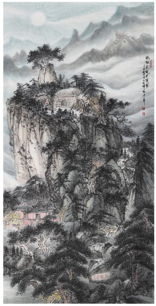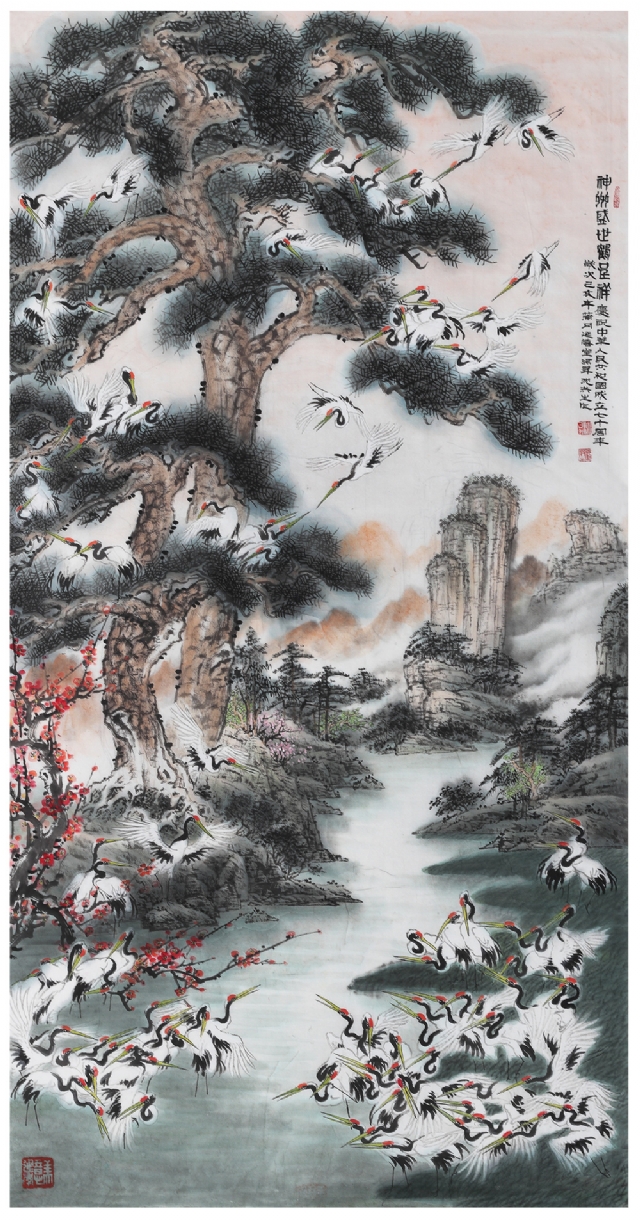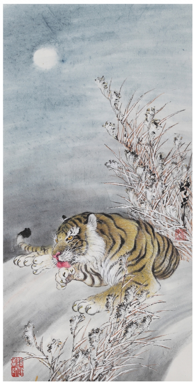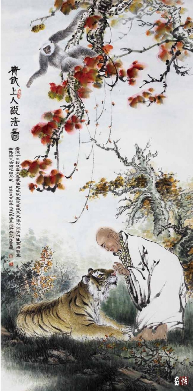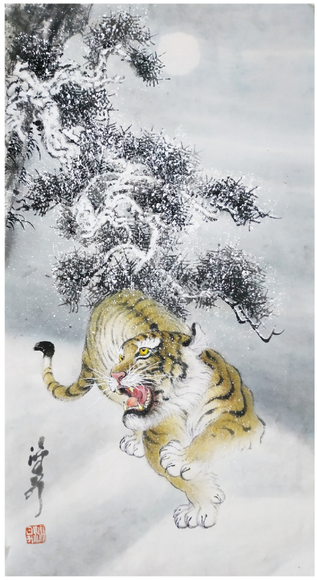 中國畫傳統(tǒng)極為淵博,畫法極為豐富,沈鴻昇在繼承傳統(tǒng)中國畫中小寫意的畫法,力求形象生動(dòng),題材富有生活氣息。在詔安畫壇,沈鴻昇筆下的虎刻畫精細(xì)、形象逼真。同時(shí),他又注重中國傳統(tǒng)繪畫的詩意表現(xiàn),老虎或在山林云水間盡情奔騰狂嘯、或閑庭信步、或傲視茫茫云海,富有情感而又充滿驍健和自然的活力,令人精神振奮、豪情滿懷。他的山水畫早期多以家鄉(xiāng)的山水為題材,主要以傳統(tǒng)畫法為家鄉(xiāng)的美麗風(fēng)景傳神寫照。退休后他多次參加各種采風(fēng)團(tuán)到全國各地寫生,將山水畫創(chuàng)作的題材擴(kuò)大到大江南北,在更廣闊的視野中領(lǐng)悟新的表現(xiàn)方法,山水畫的境界也由此而更進(jìn)一步。