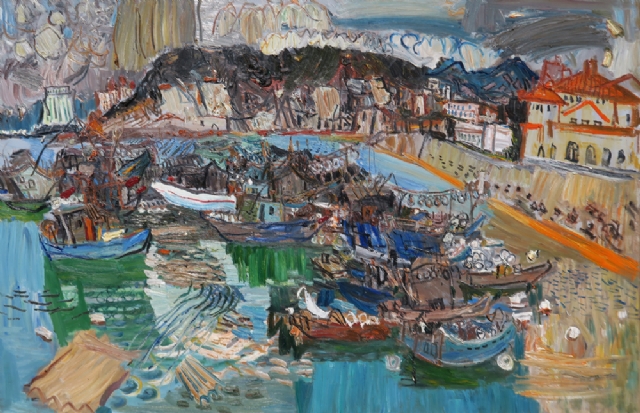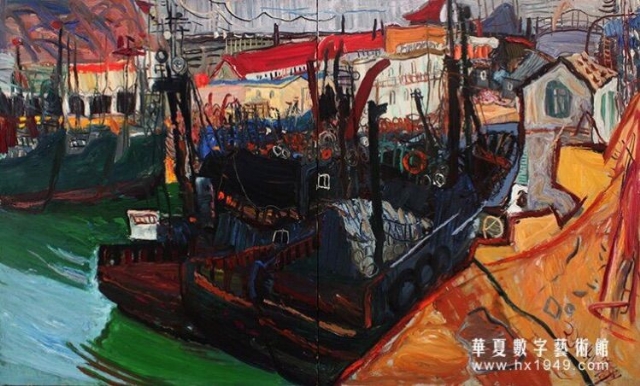 《在遙遠(yuǎn)東方的漁港碼頭》 120x200cm 入選中國(guó)文聯(lián)和中國(guó)美術(shù)家協(xié)會(huì)舉辦的第七屆北京國(guó)際美術(shù)作品雙年展,作品被中華人民共和國(guó)外交部收藏。
