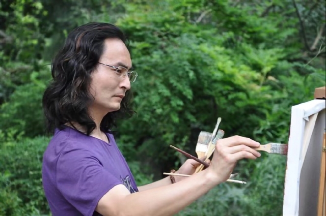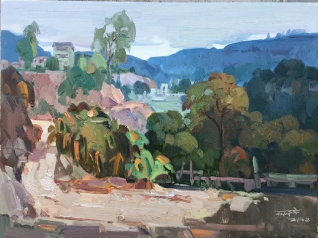 在繪畫的表現(xiàn)上,風(fēng)景寫生的方法基本是千篇一律,也就是說寫生的藝術(shù)理論已接近枯竭與死亡,嚴(yán)子宇的風(fēng)景寫生,通過釋放個體感受拯救了作品,他的寫生粗曠真切,有些題材像在他的記憶中與生俱來,比如《驕陽》,把閩中的生活細(xì)節(jié)泄露給了讀者,他的畫面表述中,勞作的漁民在晚霞的映襯中收網(wǎng),不做作,不故意夸張歌頌時代的表情,感人至深的是他作品內(nèi)容沉甸甸,避開了干癟和膚淺,他前幾年在 山西黃土高原的油畫寫生,也攝入了寓言化的寫作,他的山是人體,甚至是肉體的塊面與肌理混搭,充滿韻律和樂感,把寫生枯燥與刻板弄丟了,重新尋找了個人審美方向和線索,既有放肆的技巧又看不見他憤青的表情,這一點他是高明的。