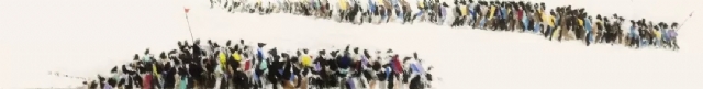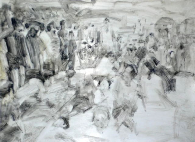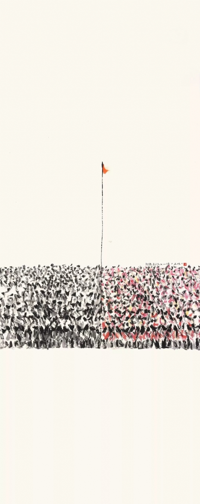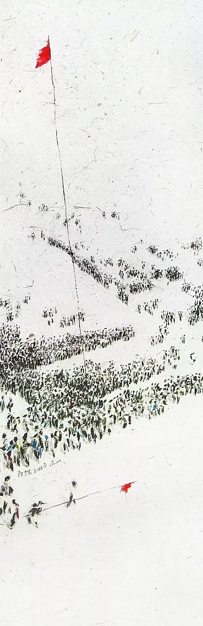 實(shí)驗(yàn)性水墨《從》系列作品十分引人注目。在畫面中,人與人相互跟隨,擠壓,碰撞,沒有面目,沒有凝視,及至視線拉長,方覺生命在涌動(dòng)。人的身份被模糊,“大地長空下,我輩,汝輩,他輩不知何故集一處,不知何因往一方?!焙甏蠖旨?xì)膩的情感暈染開來。
