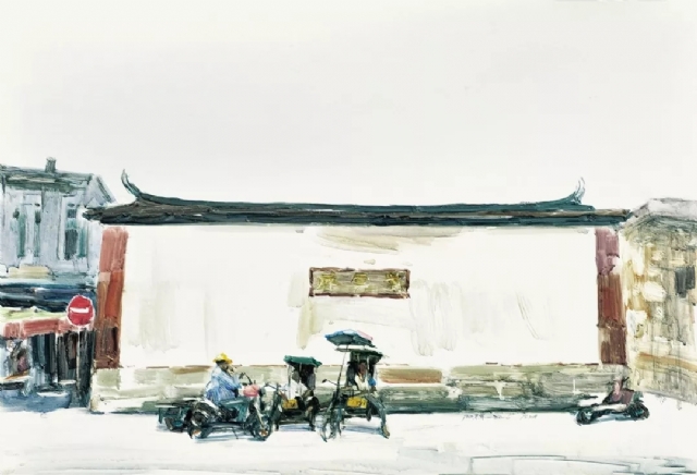 泉州古城是展開生活細(xì)節(jié)的好地方。陳陽輝沉浸其中,繁忙得很呢。但是他總能拽住從生活中沖出來的靈感,適時(shí)抽離,完成沖動(dòng)。不必“長篇大論”,即便是在碎片化的創(chuàng)作狀態(tài)下,陳陽輝也能把握高自足性的“短篇”。古城系列畫得清朗淡然,畫面偶有織入溫暖與鬧熱。目光觸碰下,總要說上一句:“這就是古城啊”。似乎是相逢之喜。