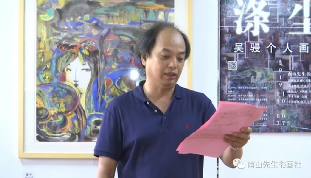 南山先生書畫社社長(zhǎng),福大廈門工藝美院繪畫系老師,畫展的學(xué)術(shù)主持余鍵女士致辭:吳骎,是天生的藝術(shù)家,創(chuàng)作思路是不用打稿,潑墨、潑彩都由心而生,藝術(shù)本真的東西,從畫面本身就能流露出來。
