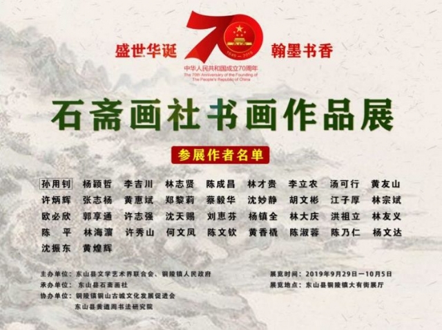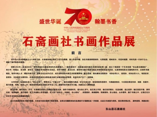 慶祝中華人民共和國成立70周年。 石齋畫社書畫作品展定于2019年9月29日上午9點10分舉行開幕儀式。敬請光臨