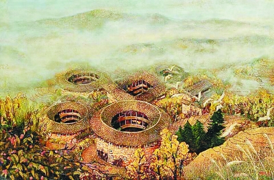 福建是客家人集中分布的省份之一,閩西和閩南是福建客家人的主要分布地區(qū)?!霸陂}西南和粵東北的崇山峻嶺中,點綴著數(shù)以千計的圓形圍屋或土樓……大部分土樓有兩三百年甚至五六百年的歷史……底層是廚房兼飯?zhí)茫赢斮A倉,三層以上作臥室,兩三百人聚居一樓,秩序井然,毫不混亂。”(《各具特色的民居》,人教版六年級語文下冊)土樓給人最直觀的印象就是它外觀的圓形。為什么是圓形?因為“客家先民崇尚圓形,認為圓是吉祥、幸福和安寧的象征”。
