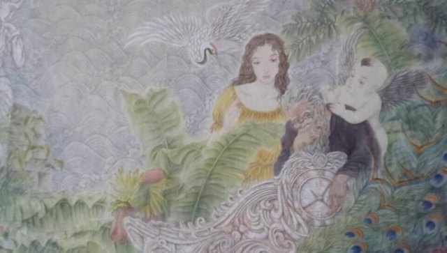 的歐式大理石門廊,也是廈門鼓浪嶼處處可見的景觀,幾乎天天經(jīng)過,所以將其置入畫面中,構(gòu)成背景的一個重要元素,除了在作品中影射自己的思想感情之外,一些生活習(xí)慣和與生活息息相關(guān)的事物也自然而然帶入其中,這也印證了藝術(shù)源于生活的道理。在我的作品中最激烈的矛盾沖突,要數(shù)背景里大片的海水和水面飛翔的仙鶴。這片海面我采用了中國傳統(tǒng)水墨畫的表現(xiàn)手法,用近乎白描的方式細(xì)致地畫出每一層波紋和水花,仙鶴也是傳統(tǒng)中國繪畫里的典型意象,這就與旁邊明顯是西方的女神雕像以及歐式門廊形成強(qiáng)烈的對比。長著翅膀的孩童,雖然理論上應(yīng)該稱為天使,但卻明顯是傳統(tǒng)中國嬰孩的典型形象,撥弄時鐘的老者卻又有西方圣誕老人的影子,這些看似矛盾的元素放在了一起,構(gòu)成了這幅表現(xiàn)時間和生命的作品,但他們又是統(tǒng)一在這種象征和隱喻的風(fēng)格之下,正所謂“和而不同”,各種元素,各個意象在畫面里和諧共生,這正是中國傳統(tǒng)自然美學(xué)精神的體現(xiàn),何況生命中本也是充滿了矛盾沖突,需要不斷磨合,才能走向和諧與完善。