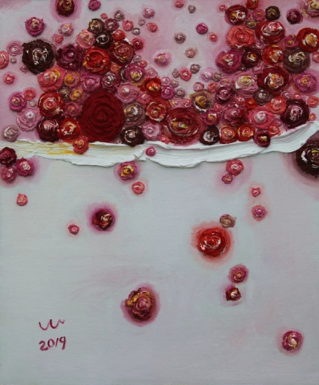 她的作品用最自然的表現(xiàn),在當代油畫語境中游走。這些花甚至省略掉葉子,花朵永遠盛開在一個特別的環(huán)境中: 一片飄浮在空中的紙箋上、一塊億年的蒼石里,一張癡情傾訴的戀人面孔中、一個綠色的祼女胴體間,等等均是不可能在現(xiàn)實中自然呈現(xiàn)的位置,但同時又是最理性的位置,以浮雕似的描繪把花的最原始狀態(tài)呈現(xiàn)于觀者的眼前。無論是雅拙的正襟直面,還是或圓或方的茂然鋪陳,胡山山的玫瑰永遠以如砌似雕的厚度,把生命中最鮮活的真實之美呈現(xiàn)在你面前。