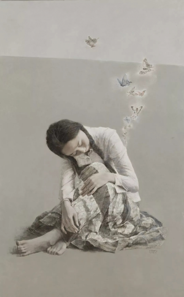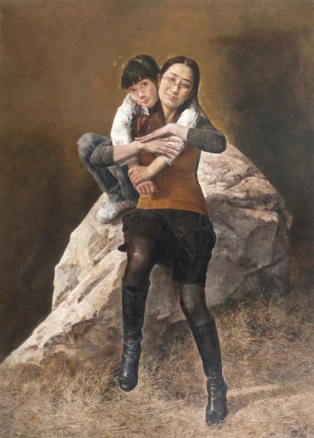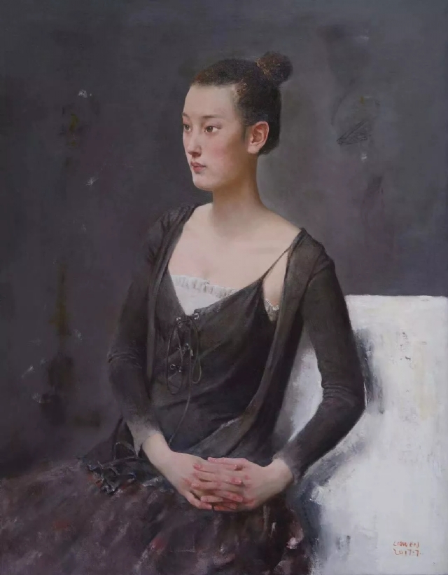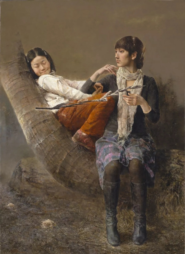 《雨夏》的人物原型是我的妻子和女兒:她們有時像鬧山的麻雀,唧唧喳喳歡快嬉鬧,臉上“開岀”燦爛的“花朵”;有時莫名地感傷流淚。女性的這種心理和情緒猶如夏日的天空,時而陽光明媚,時而陰云密布。為表現(xiàn)女性這種變化無常的心理和情緒,我選擇夏日驟雨將至時這個極富情趣的瞬間作為依托,既與畫面氛圍和情調相合,又暗示了人物的心理狀態(tài).作為“宇宙之精華、萬物之靈長”的人,有著千姿百態(tài)的變化和豐富的表情,反映出其體型、外貌、生活經歷、內心世界等,在某種意義上也折射出時代生活的特質。