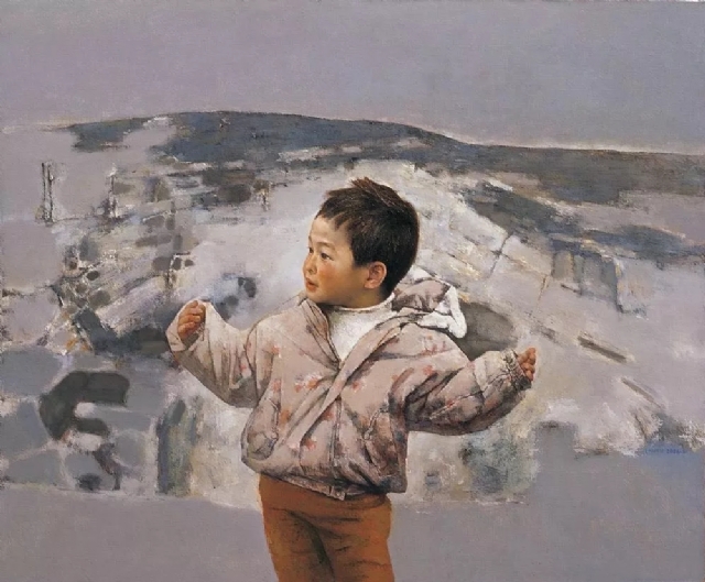 《春風又綠》取材于一年春節(jié)我女兒在一個覆蓋著殘雪的玉米稈垛上玩雪的情景,很有畫意,回家后我便以這個素材進行創(chuàng)作:小女孩站在雪堆旁遙望遠方,背景近處是覆蓋著殘雪的一堆玉米稈,遠處冰雪消融,露岀嫩綠的麥苗,顯示出萬物無限的生機和頑強的生命力,表達對生命的禮贊。