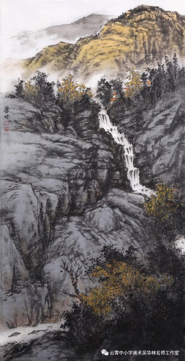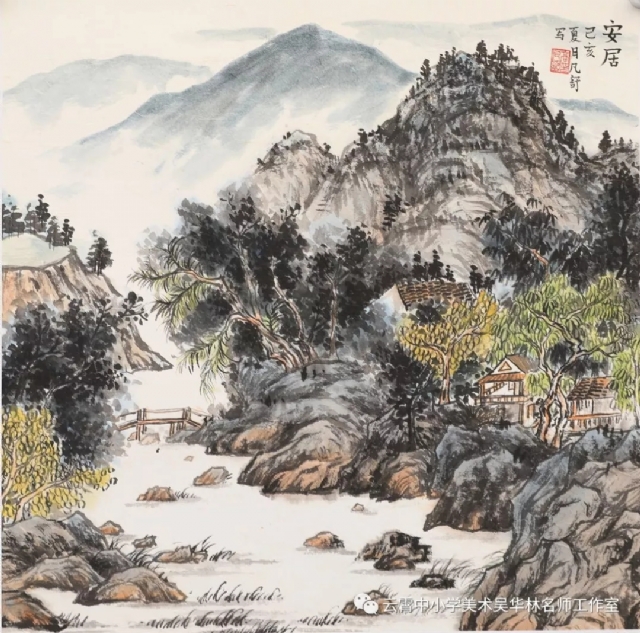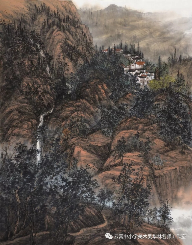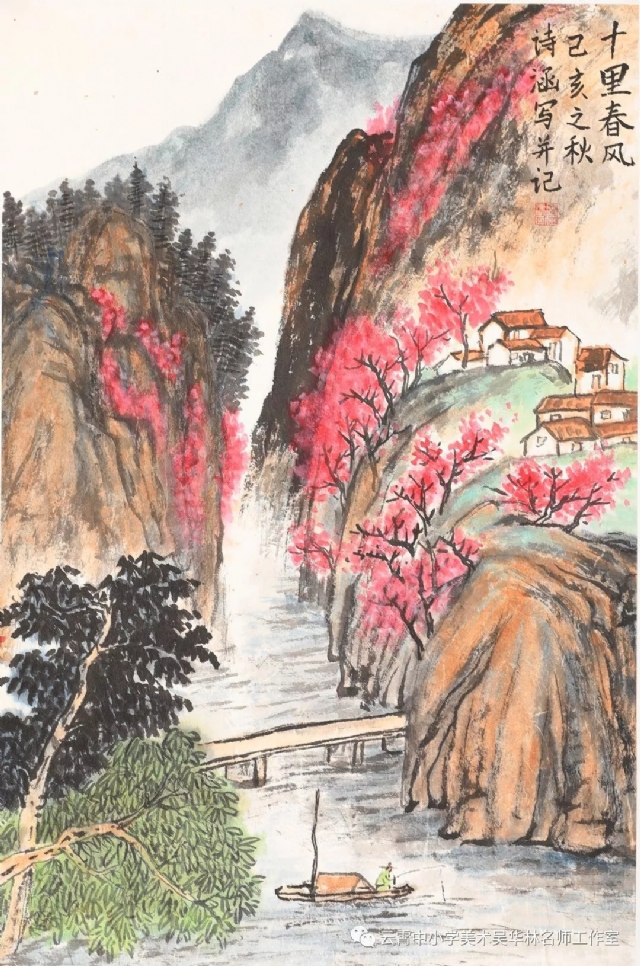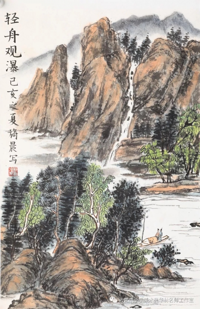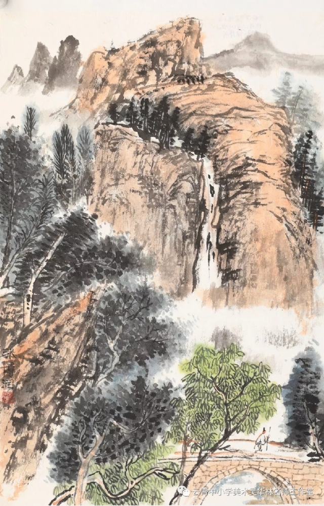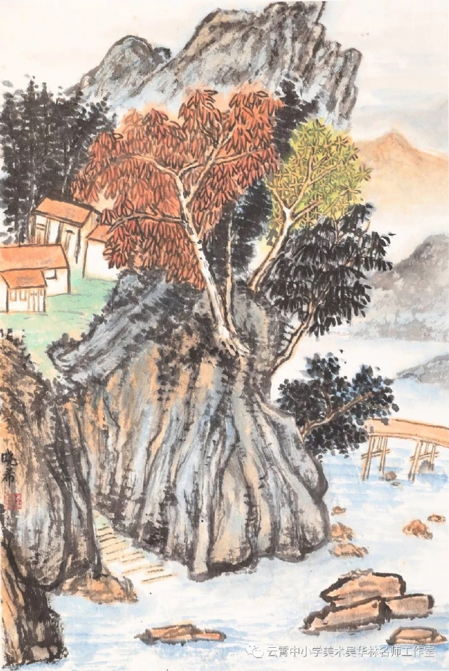 教師有計劃進行教學嘗試,首先以《芥子園》為教材范本,由傳統(tǒng)筆墨入手,先用分塊教學的形式,由樹、石、山、房屋、亭臺樓閣,舟楫,云霧,水口、瀑布流泉等等各塊分別安排課時,以示范臨摹為主,解決基礎問題;第二步進行組合練習(提出具體要求,比如畫面上必須出現(xiàn)何種景物等等,或教師半扶半放,總體構圖,示范部分再讓學生添畫完成等;第三步就是教師命題,或提供景觀圖片(不方便組織寫生,只能出此下策),學生嘗試創(chuàng)作。學生雖然基礎不同,年齡不同,學段不同,但是在短期里學習還是取得較好的學習效果,這一點可以從本次展示的作品中看出來。