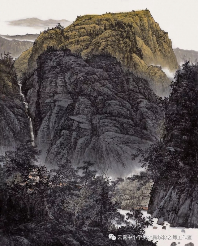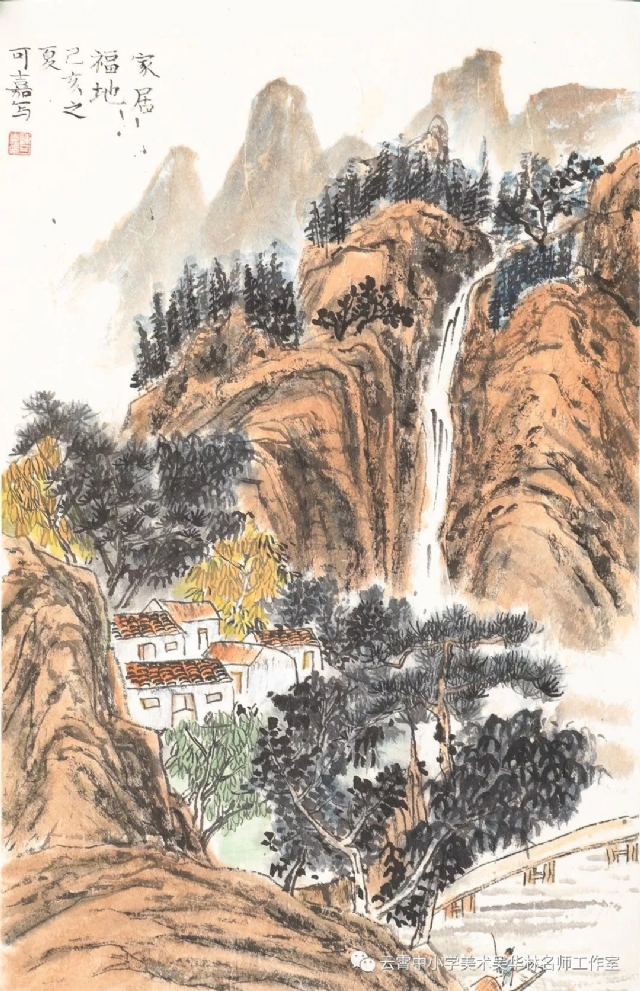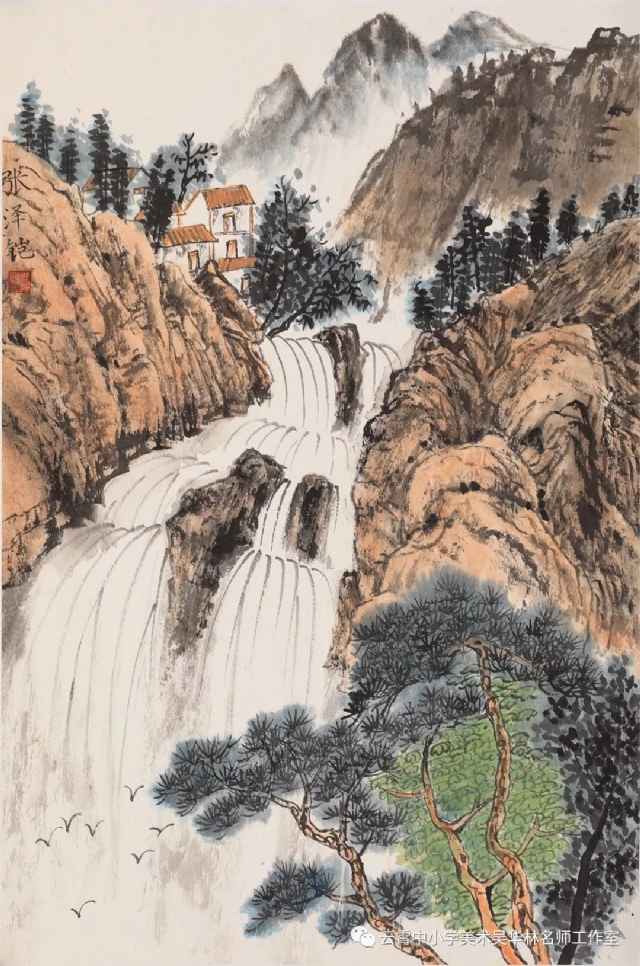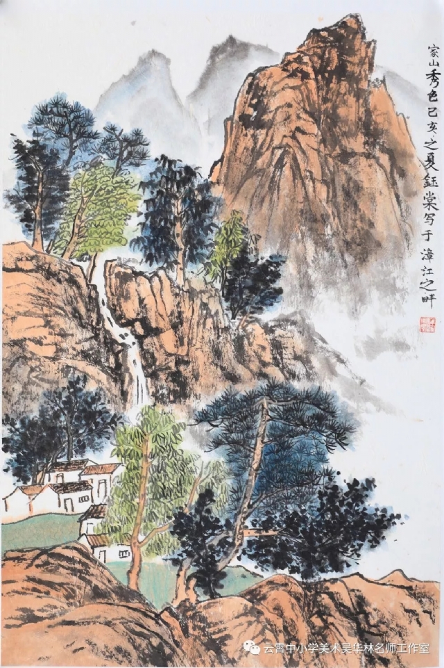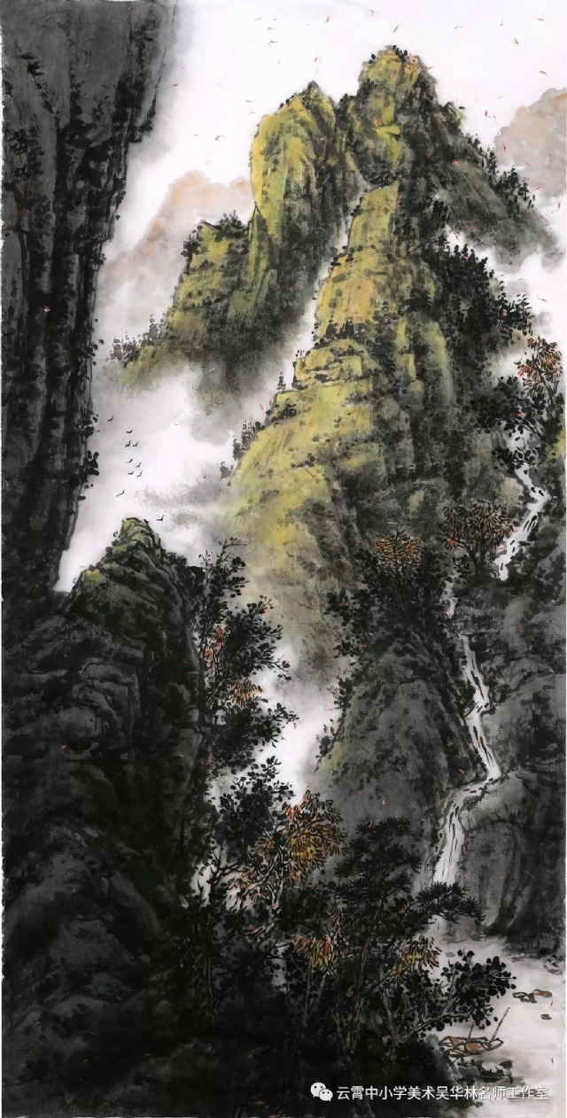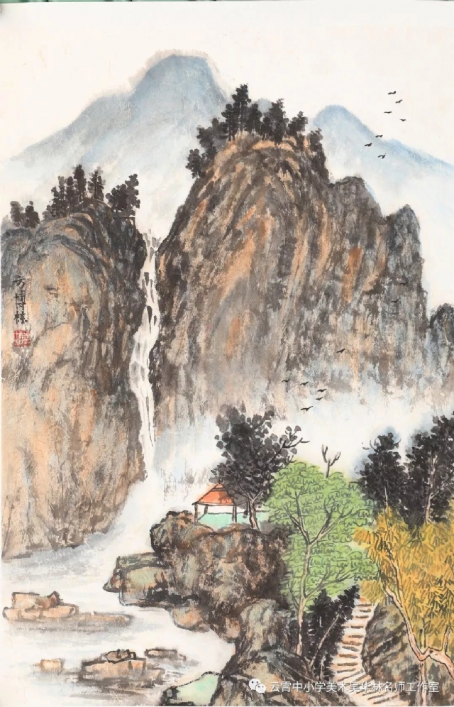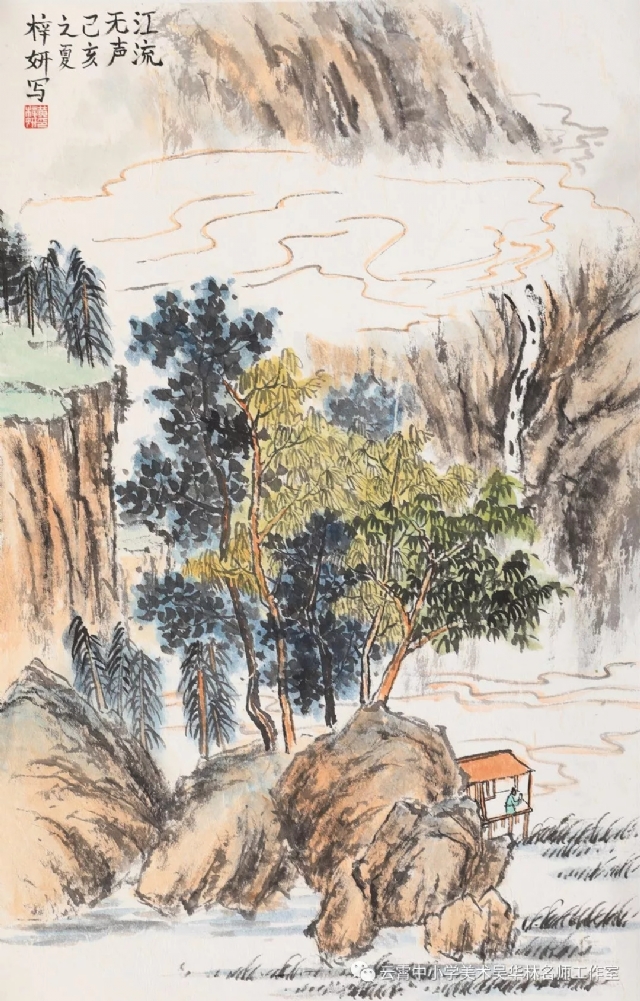 從這次呈現(xiàn)的不同年齡段的學生作品中,我們可以感受到從作品里頭所傳達出來的童真童趣和學生對山水畫的初級感知,老師做了過程性的嘗試,積累了第一手的教學心得與經(jīng)驗。雖然學生作品筆墨尚稚嫩,設色也帶有主觀意向,但天真樸實,學生們在創(chuàng)作過程中愉悅體驗,在得到"線"與"形"鍛煉的同時,感受到畫面潺潺流水、樹木蔥蘢的唯美和云霧后面的虛幻與神秘、從而深切感受到山水畫的意境美。短期內的教學,能取得這樣的效果,也實屬不易。我們也期待,在進一步的實驗教學中,再次總結,提煉出一套行之有效的方法并付諸于實踐。