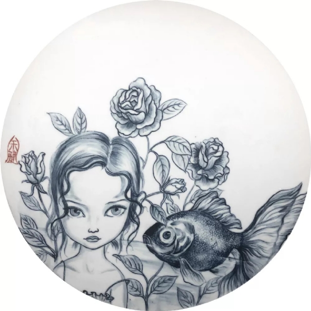 “最初,在景德鎮(zhèn),我和幾位陶瓷藝術(shù)家接觸,我嘗試在現(xiàn)成的瓷器造型上,以青花等傳統(tǒng)的釉料與手法,創(chuàng)作一批具有女性主義風(fēng)格的線性造型的作品?!庇噫I說,中國畫白描與渲染的手法雖然相對傳統(tǒng),但有感于瓷與女性的特質(zhì),進(jìn)行了結(jié)合的嘗試,在瓷的溫潤感與女性符號(hào)、母子主題展開了融合。