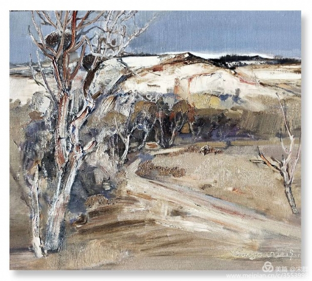 雪景也是畫家喜愛的畫面,簡(jiǎn)潔的色彩更有張力。茫茫原野上的一棵樹,一座房屋,歪歪扭扭的柵欄,很有規(guī)律的地壟溝等等,都是畫家喜愛的元素,它們?cè)诋嬅嫔闲纬闪肆鲃?dòng)的音符,流動(dòng)著北方特色的音律。