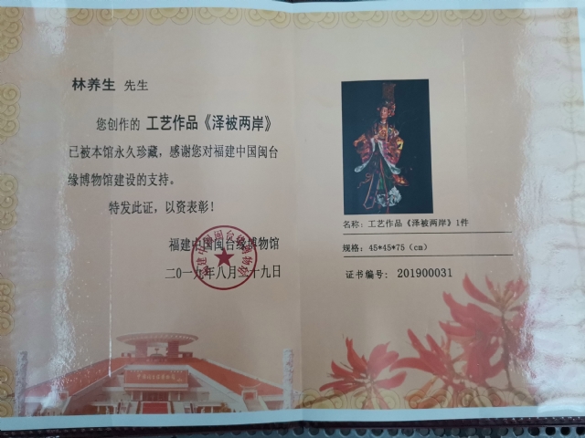 2019年6月8日參加福建省工藝美術(shù)學(xué)會民間工藝專業(yè)委員會在閩臺緣博物館主辦,中國文化遺產(chǎn)日暨中國工藝美術(shù)學(xué)會美術(shù)科普教育日活動展示,作品被收藏,今天發(fā)證書合影留念。