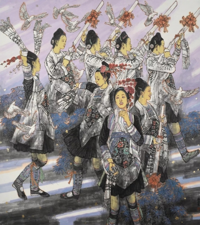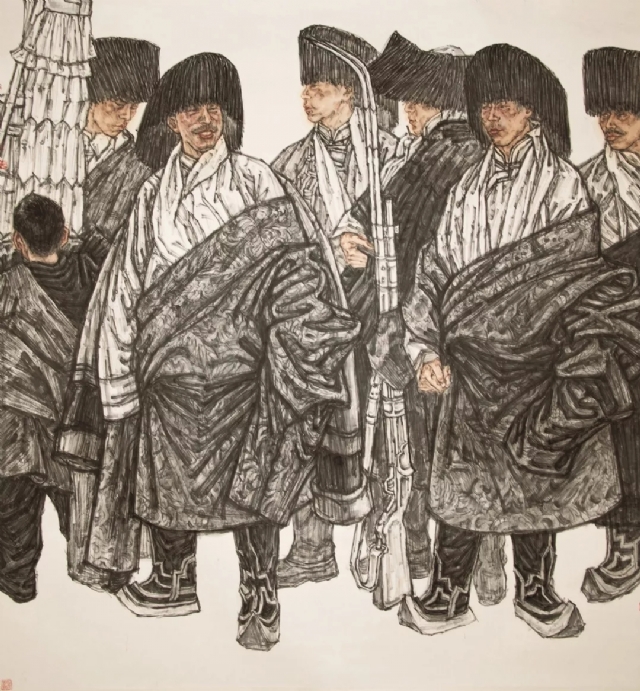 這種雄渾而大氣的畫(huà)風(fēng)在審美內(nèi)涵上包括兩個(gè)層面:一是突出中華民族在當(dāng)代文化創(chuàng)造上的文化自覺(jué),二是強(qiáng)調(diào)中華民族的當(dāng)代歷史創(chuàng)造。中國(guó)當(dāng)代社會(huì)的發(fā)展已由模仿和學(xué)習(xí)階段逐漸轉(zhuǎn)向自主創(chuàng)造和創(chuàng)新階段。在這種歷史發(fā)展階段,中華民族在精神上必須有所準(zhǔn)備。在中華民族歷史上,涌現(xiàn)出了不少英雄人物,既有開(kāi)疆拓土的英雄,也有保家衛(wèi)國(guó)的英雄。在中華民族偉大復(fù)興的征程中,中華民族不僅需要岳飛、文天祥這樣保家衛(wèi)國(guó)的英雄,更需要衛(wèi)青、霍去病、薛仁貴這樣開(kāi)疆拓土的民族英雄激勵(lì)民族奮發(fā)圖強(qiáng),開(kāi)拓創(chuàng)新。這是中華民族實(shí)現(xiàn)現(xiàn)代化應(yīng)有的精神準(zhǔn)備。王新倫在中國(guó)畫(huà)創(chuàng)作中沒(méi)有挖掘中國(guó)當(dāng)代社會(huì)基層民眾的一些保守自私、固步自封的弊端,而是著力展現(xiàn)了這些基層民眾主動(dòng)地與外面世界交流的敞亮心胸。