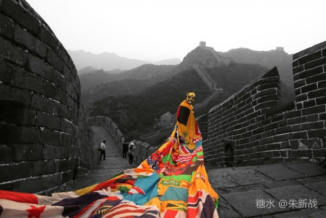 藝術(shù)家朱新戰(zhàn)收集世界各國國旗,以解構(gòu)再重構(gòu)來展開行為,最后旗袍加身。在藝術(shù)家眼里,國旗僅是一個人類自以為是的邊界,盡管嘗試一體化的歐盟面臨崩潰的危險,藝術(shù)家的主觀還是世界的大同,藝術(shù)的大同,愛的一體。